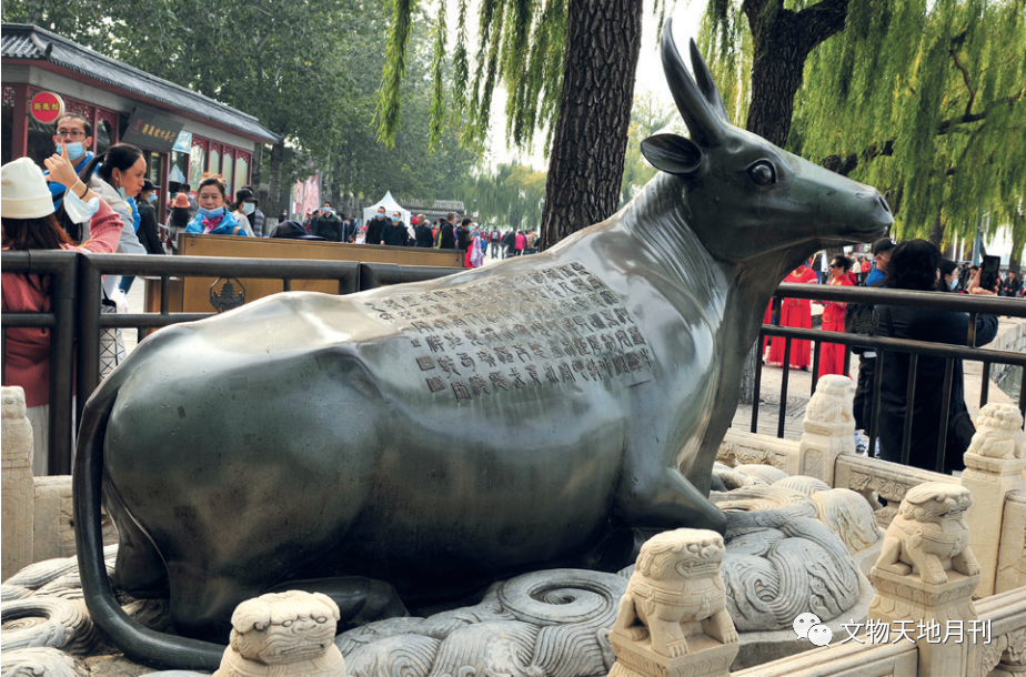 山西永济蒲津渡现存的4件铁牛(图四一),铸造于唐开元十二年(724),唐人张说作《蒲津桥赞》记录造桥铸牛一事。有学者统计,全国现存的古代大铁牛还有15尊,大型铜牛5尊,铜牛西夏至清代均有传世品。乾隆皇帝效仿大禹治水铸铁牛镇水之说撰《金牛铭》,乾隆二十年(1755)下旨为昆明湖铸造铜牛(图四二),颐和园现存铜牛背上即铸有乾隆御书八十字的篆体铭文“夏禹治河,铁牛传颂。义重安澜,后人景从。……金写神牛,用镇悠永。……”。