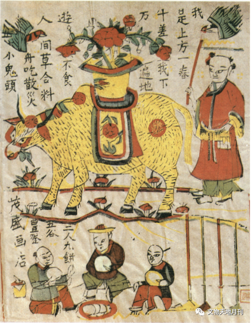 “九九加一九,黄牛遍地走”,农业社会耕作是国家大事,二十四节气立春的春忙即从“献春牛”“打春牛”始,此俗始自汉代,盛于明清,上至天子下至平民,迎春、打春都是举国上下的重要活动。山西新绛茂盛画店的《春牛图》(图四五)版画,上刻“我是上方一春牛,差我下方遍地游。不食人间草合(和)料,丹(专)吃散灾小鬼头”,中刻一童赶春牛图,下刻“三人九饼,五谷丰登”及三人分饼图。