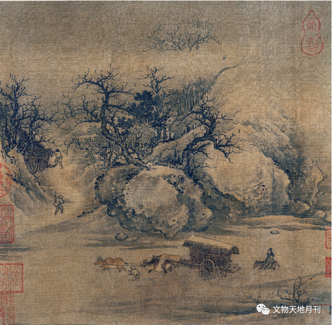 文学、绘画艺术兴起于汉魏,发展于唐代,遗憾的是唐画传世不多。宋代文人画兴起后,牛成为文人画笔下表达乡村恬静、美好生活的重要题材,李迪、毛益、阎仲、李唐、夏圭、阎次平、马麟等均是画牛名家,“牧牛图”宋时成为独特的文化意象。台北故宫博物院藏北宋名家李迪的《风雨归牧图》(图四七)可谓代表作之一,图绘狂风大雨中两牧童戴斗笠、披蓑衣骑在牛背上匆忙赶路的场情,图画动感十足,工写兼备。两宋宫廷画家朱锐的《溪山行旅图》散页(图四八),画幅虽小,却也表现出了冬日北方行旅之不易。两宋失去了西北、东北、内蒙古的养马要地,军事力量极弱,河北籍画家朱锐随宋室南渡,江浙地区潮湿不适养马,水乡以舟船代步,陆上交通多以牛车为主。