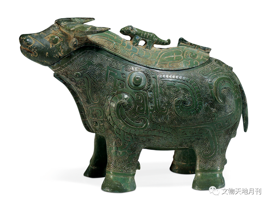 商周时期,牛的形象大量出现在青铜礼器中,充分展现出人们对牛的崇拜和重视。考古发掘出土的青铜礼器中,直接以牛作为造型的器物不多,目前商代仅见2件。一件是殷墟花园庄东地M54出土的牛尊,通长40、带盖高22.5、腰围52.5厘米,重7.1千克(图一)。整体呈体态健壮的牛形,头前伸,嘴微张,面额下凹,臣字形眼,眼球凸出,两耳外展,双角向后弯卷。背微下凹,上有一长方形盖,盖中部有半环形小纽,盖与器身为子母口扣合。牛腹丰肥,腹下有四条粗短的腿,牛蹄后部有凸起的小趾。臀部浑圆,短尾下垂,尾端呈纺锤形。这件牛尊纹饰繁缛、精美。牛眼两侧各饰一小虎纹,卷云纹角,长身拱背,尾端上翘,腹下有双足,足端有利爪,体饰鳞状纹。牛下颌两侧各饰一鱼纹。耳下饰小鸟纹,小鸟头向牛背,勾喙,圆眼,长尾下垂,尾端分叉。牛双角饰节状纹。颈两侧饰夔纹,夔口向下作倒立状,张口,卷鼻,圆角方形眼,瓶形角。牛颈上部饰饕餮纹,饕餮为圆角方形眼, 张口露齿, 粗鼻梁,双角上竖。腹部两侧饰虎纹,虎头向下,对着前腿, 张口露齿,嘴角上翘,圆角方形大眼,卷云纹角。虎躯体较长,尾顺臀部下垂,尾尖向外弯卷。虎前足在牛腹中部,后足在牛后腿上部,足端有四利爪。虎身及双腿饰双线节状纹,尾饰鳞状纹。在虎背上部有一条夔纹,躯体较长,一足,尾部上卷。虎前后腿之间有两条短体夔纹,口对着虎足。牛尾左右两侧各饰一S形直立夔纹。牛臀部及四足还有夔纹,但因锈蚀已模糊不清。尊上所有的主纹均以细密的云雷纹衬地。尊盖上纽两侧各有一夔纹,左右对称,卷云纹角,圆角长方形眼,直身,尾部弯折,尾端内卷。盖纽顶部饰菱形纹,纽足两端饰饕餮纹。这件牛尊装饰动物纹种类多,有虎、鸟、鱼、饕餮、夔龙,数量也多,其中虎4个(2大、2小)、鸟2个、鱼2个、饕餮4个、夔14个以上 。