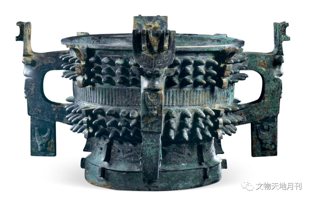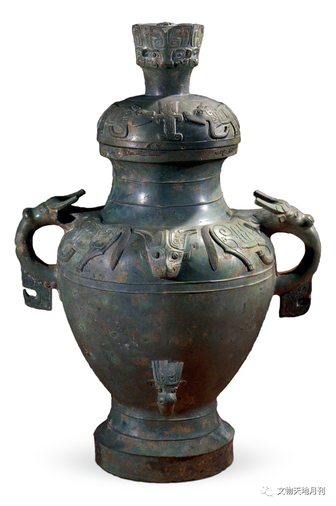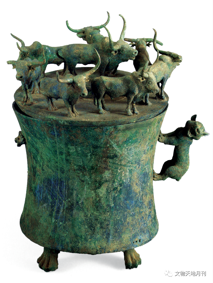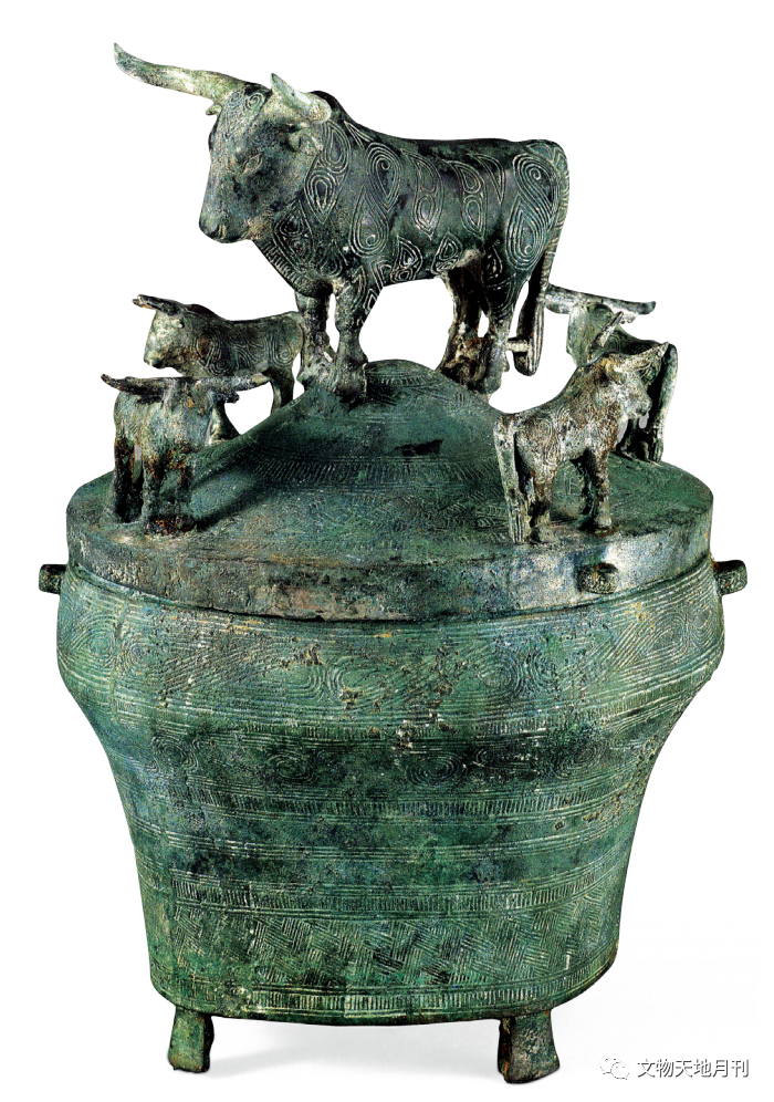 宝鸡石鼓山、纸坊头、戴家湾各出土1件四牛纹方座簋,器形、纹饰极为相似,簋身四周分置4组牛首环耳,耳下有长方形垂珥,两耳之间设置扉棱,在环耳和扉棱上共装饰牛首图案28组(图四)。事实上不仅在中原,牛形元素在古巴蜀青铜文化中也很盛行,在四川博物院的青铜馆内,有一件独特的巴蜀青铜器杰作——牛纹铜罍(图五)。其盖盘上铸有两两相向的四头跪牛,直口,方唇,高颈,圆腹,下部内收,圈足,颈肩及圈足上各饰弦纹二周。罍双耳为圆雕牛头形,而牛身一分为二饰于肩两侧,两牛尾之间再饰一牛头,腹下另饰一小牛头形耳。所有的牛纹都采用写实的圆雕或高浮雕塑造。值得一提的是,牛纹罍上所饰之牛,都有一对弯曲的牛角,应是耕田所用的水牛形象。