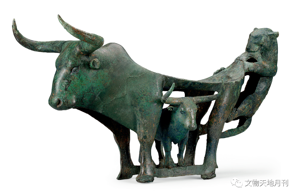 春秋时期的铜器上时常装饰牛,河南郑公大墓出土、现藏于台北历史博物馆的春秋晚期周牢鼎,腹部装饰一牛首;用于兵器的装饰的有河南鹤壁辛村卫国墓地出土的一件钩戟,其上饰有牛首正面像;赵卿墓出土的盖鼎,盖上有三个卧牛形纽,这在当时的铜器上非常普遍。安徽寿县丘家花园出土战国错金银卧牛镇,造型生动,制作精美。