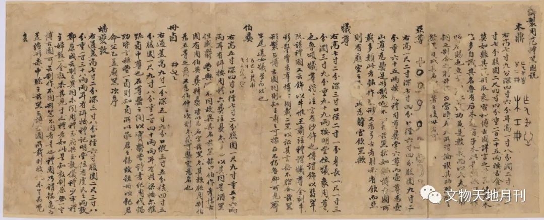 周亚尊乙:右亚尊高一尺二寸,深七寸四分,口径六寸四分,腹围九寸二分,重六十五两。按,周礼司尊彝掌六尊,而壶尊为壶,山尊为罍,是形制迥不一矣。兹器状如觚,博古图所载多类此者,铭作亚,形又为弓,古者射必有饮,而亚则有庙室之义,意此为射宫饮器欤?