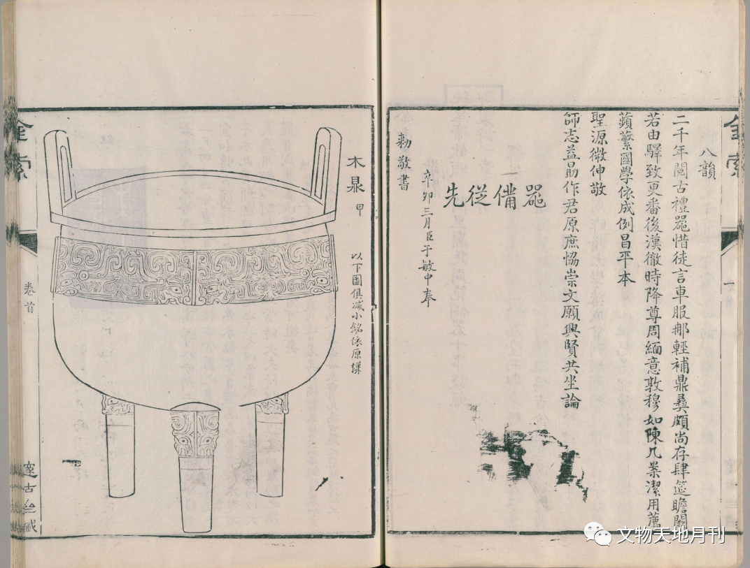 对于《曲阜县志》记载的这个错误,当时的学者姜克谨即已发现并指出。姜克谨,一名思永,字亚慎,号兼山,祖籍山东东平,自高祖姜文泰担任至圣林庙守卫百户起,始占籍曲阜。他攻篆刻,精考据,为著名学者桂馥的门人,并充任孔庙诗礼堂启事一职,有机会观瞻“十供”。姜克谨在发现县志中的错误后,在所著《慎余草堂余草》中记载:“木鼎注是图非,误刊蟠夔敦,下第七图乃木鼎也;亚尊注是图非,误刊册卣,下第九图乃亚尊也;牺尊不误;伯彝注是图非,误刊夔凤豆,下第六图乃伯彝也;册卣注是图非,误刊伯彝,上第三图乃册卣也;蟠夔敦注是图非,误刊木鼎,上第一图乃蟠夔敦也;宝簠不误;夔凤豆注是图非,误刊亚尊,上第五图乃夔凤豆也;饕餮甗不误;四足鬲不误。”不知何故,姜克谨虽然指出了县志(图四)的错误记载,但除“上第一图乃蟠夔敦也”外,其他部分仍然没有完全修改正确,“下第七图乃木鼎也”实为第六图,“下第九图乃亚尊也”实为第八图,“下第六图乃伯彝也”实为第五图,“上第三图乃册卣也”实为第二图,“上第五图乃夔凤豆也”实为第四图。金石学者冯云鹏也发现了该问题,谓“续见潘氏县志所刻,虽云遵依图册,而镂文不类,且以敦为鼎,以鼎为敦,以卣为尊,以彝为卣,以豆为彝,以尊为豆,颠倒错乱,人无知者,心滋惧焉”,如此才将县志记载之误完全改正,于是冯云鹏“手拓其铭,选工绘图,悉遵原式”,将“十供”之图与图说收录在《金石索》中(图五),印制精美,纹饰准确,生动传神。