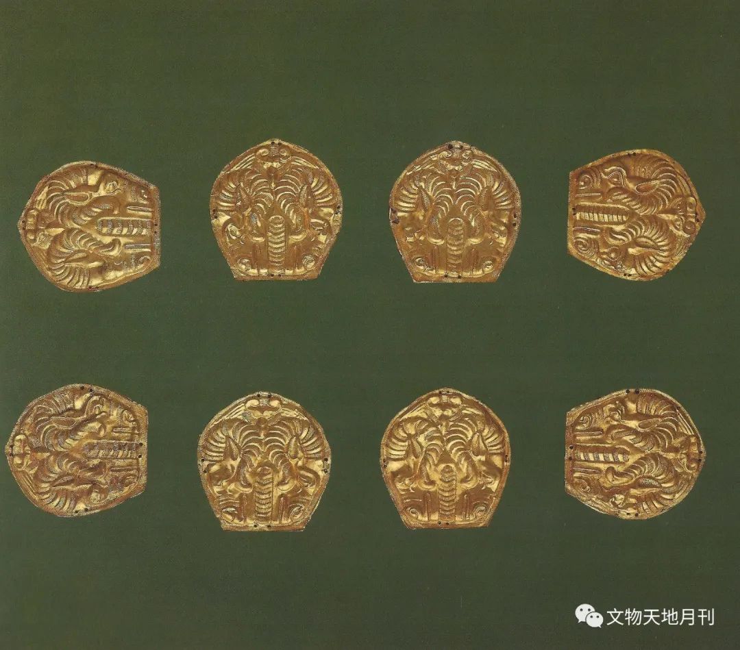 不过,南越王墓的8枚对羊纹金饰片出土位置在墓主人头部位置(图二五),而金花泡饰则在墓主人胸前,考古发掘者认为这8枚对羊纹金饰片是独立的一套缀饰,很可能是覆盖在面上瞑目的缀饰,然而丝织物已无可见,无法确定。不过,可以确定的是,这8枚对羊纹金饰片是属于头端某物的缀饰。