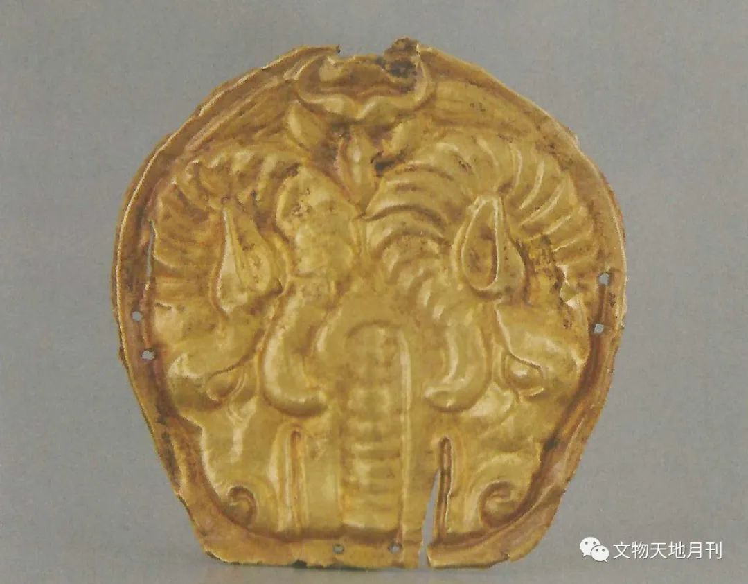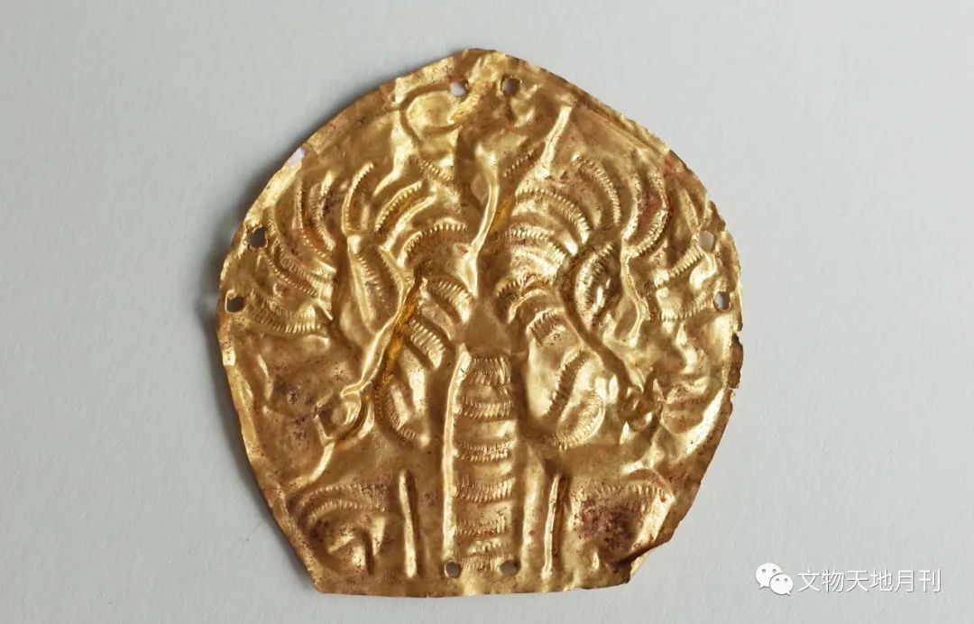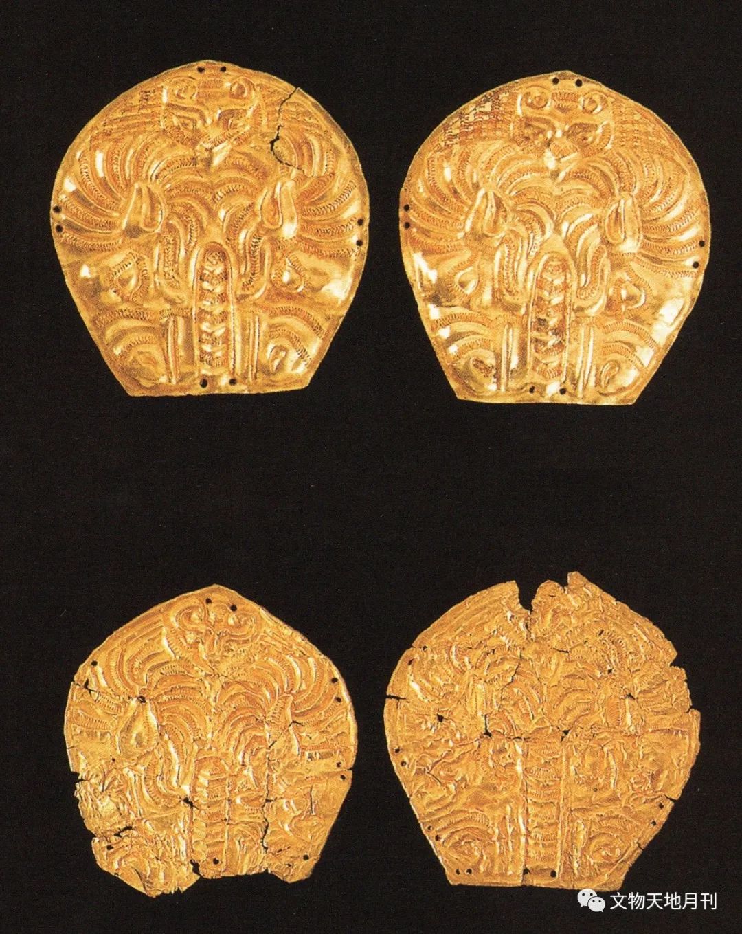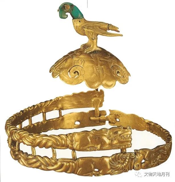 在中国北方及阿尔勒以东、以西的草原民族中,贵族中流行各类以黄金制成的冠饰,但是这类冠饰多以各类缀饰为主,冠顶饰却少见,如内蒙古杭锦旗阿鲁柴登匈奴墓出土的金冠饰(图二七),不过学者认为这件器物的冠饰顶应为中原工匠的制品。