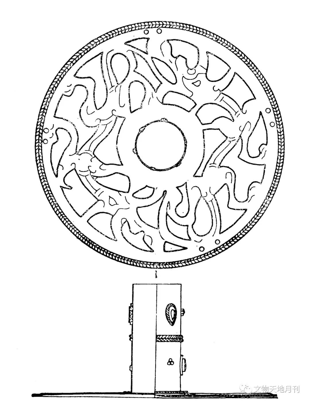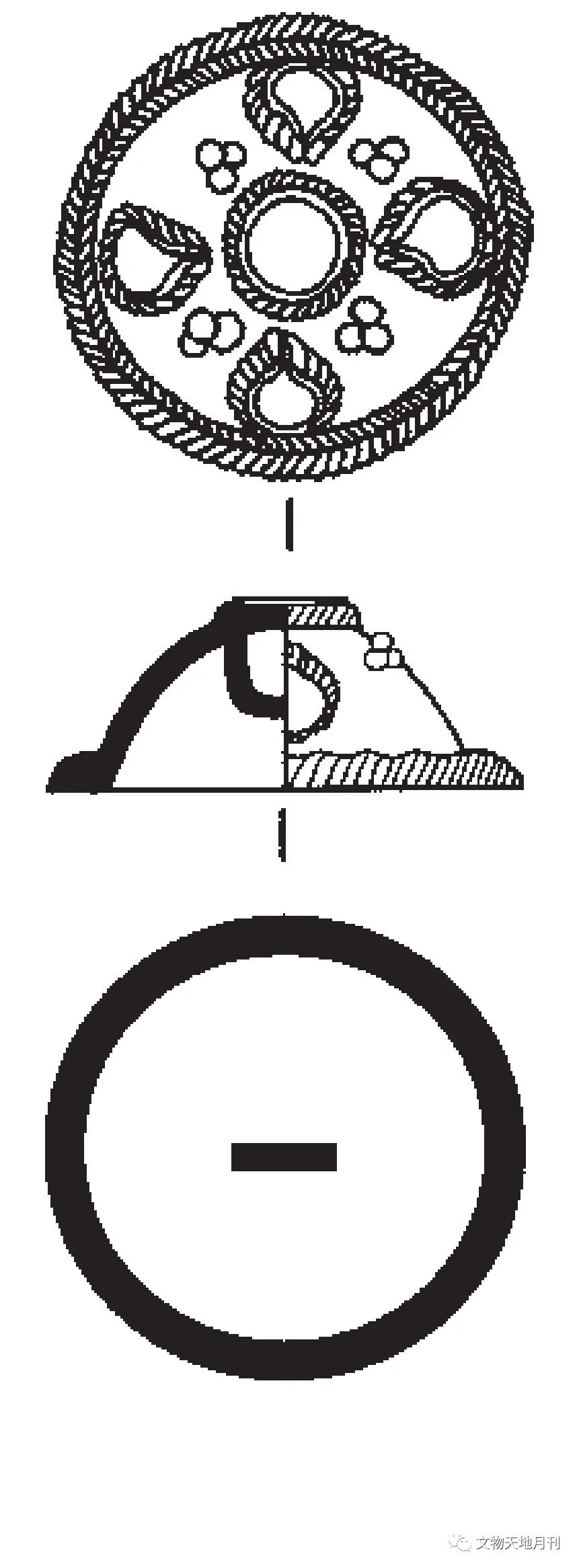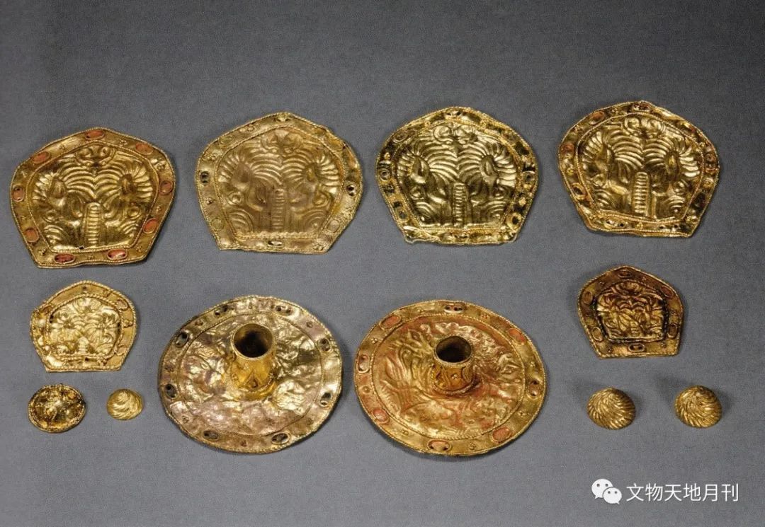 在中国北方及阿尔勒以东、以西的草原民族中,贵族中流行各类以黄金制成的冠饰,但是这类冠饰多以各类缀饰为主,冠顶饰却少见,如内蒙古杭锦旗阿鲁柴登匈奴墓出土的金冠饰(图二七),不过学者认为这件器物的冠饰顶应为中原工匠的制品。