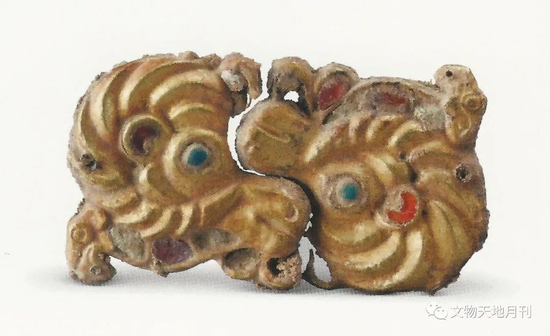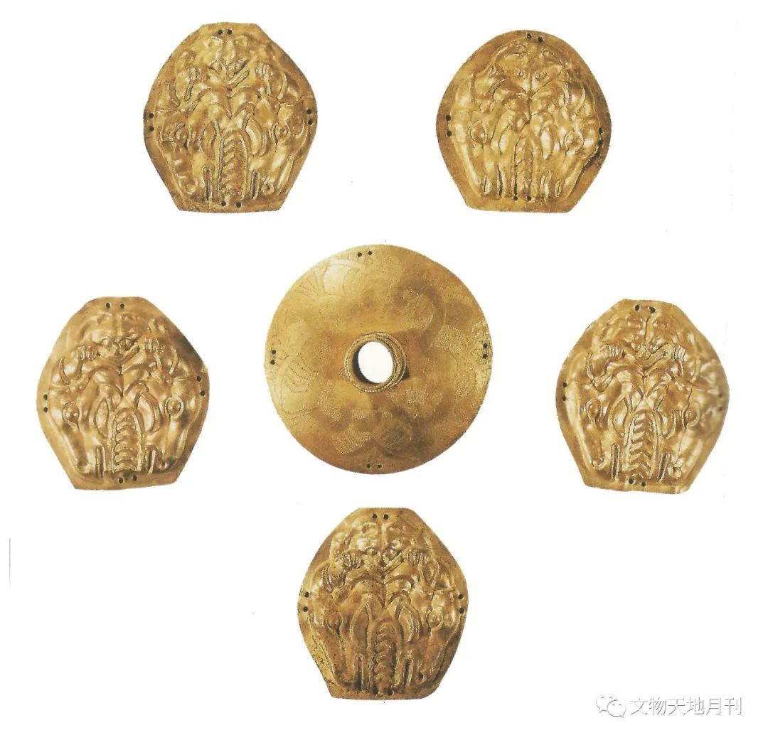 再来看看邯郸市钢铁总厂西区墓葬的出土情况,这5件对羊纹金饰片与1件缨座组成一套冠饰(图二六),显然属于头部的缀饰之一。