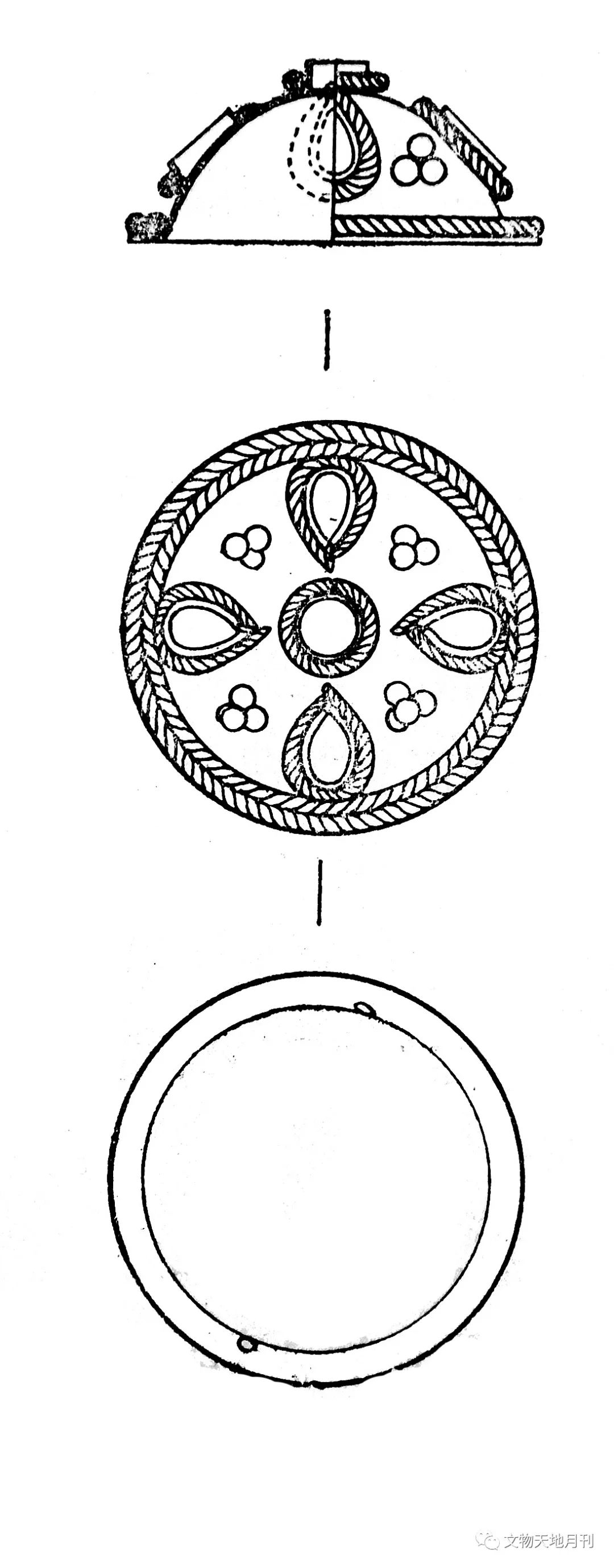 这里,我们重新审视南越王墓、满城汉墓M1、浮来山汉墓的出土情况:南越王墓的对羊纹金饰片出于主棺室,同出于该室的也有金花泡饰,形制与大云山汉墓M1的金花泡饰一致;满城汉墓M1除出土对羊纹金饰片,也出有圆形金饰片,形制与大云山汉墓M1的圆形金饰片相似;浮来山汉墓的情况和南越王墓的情况一样,同出对羊纹金饰片和金花泡饰。通过以上的出土情形,我们可以大致确定,对羊纹金饰片与金花泡饰、圆形金饰片是有着密切联系的,它们相互之间可以组成一套缀饰(图二〇至图二四)。