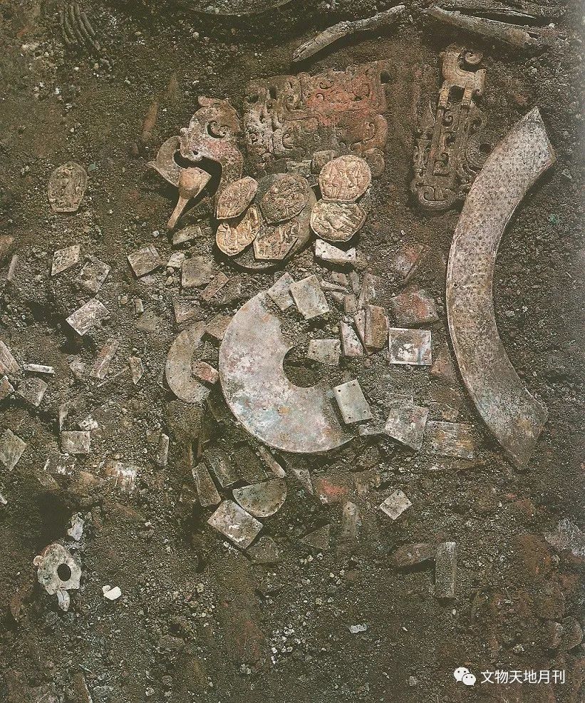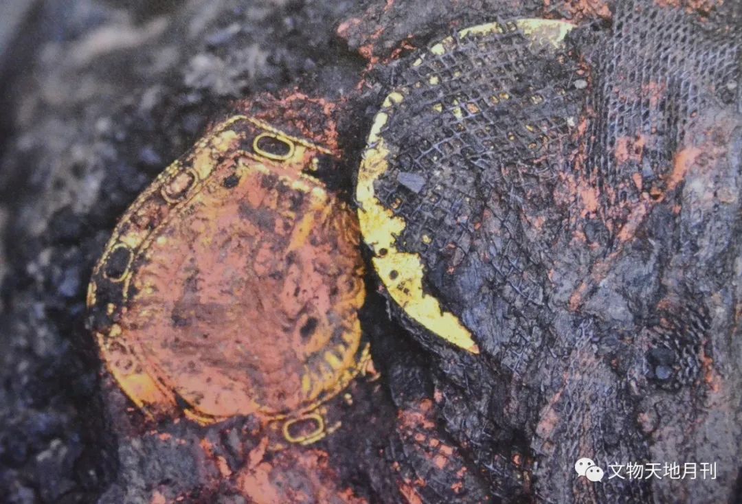关于这类对羊纹金饰片的用途,它们作为缀饰应是毫无疑问的,因为每一件金饰片都有若干个穿孔用以编缀,大云山汉墓M1的对羊纹金饰片出土时,附着其上的红色丝织物清晰可见(图一八),同出的还有其他金花泡饰、圆形金饰片等,说明它们是一组缀饰(图一九)。