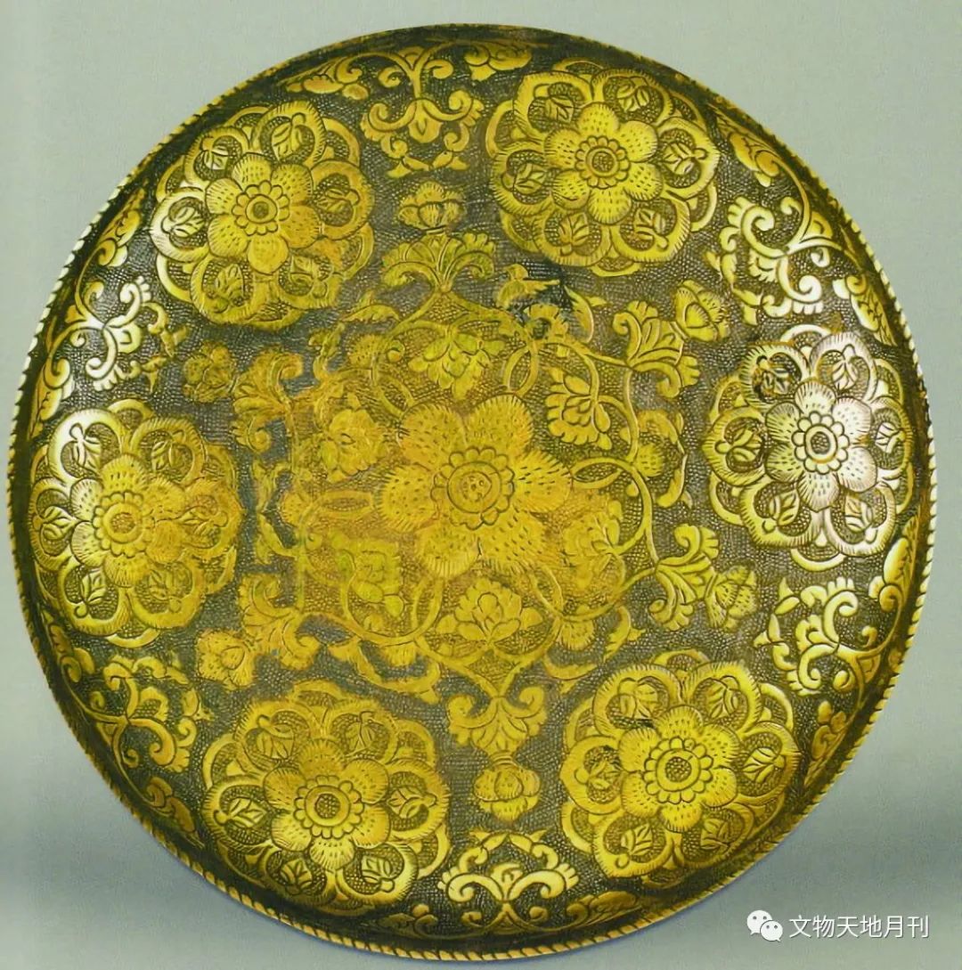 鎏金,亦称“涂金”“镀金”,是指把金和水银混合制成金汞齐,涂在金属器物表层,再加热使水银蒸发,从而使金牢固地附在铜器表面不脱落的技术。该传统工艺历史悠久,最初作为青铜器装饰方法,战国时已有在银器表面涂金的工艺,在东周和汉代以后更加成熟,是当时最值得称道的铜器表面装饰工艺之一。后用于银器装饰,银器鎏金工艺兴盛于唐代。唐代银器的主体纹饰多数鎏金,故称之为金花银器。
