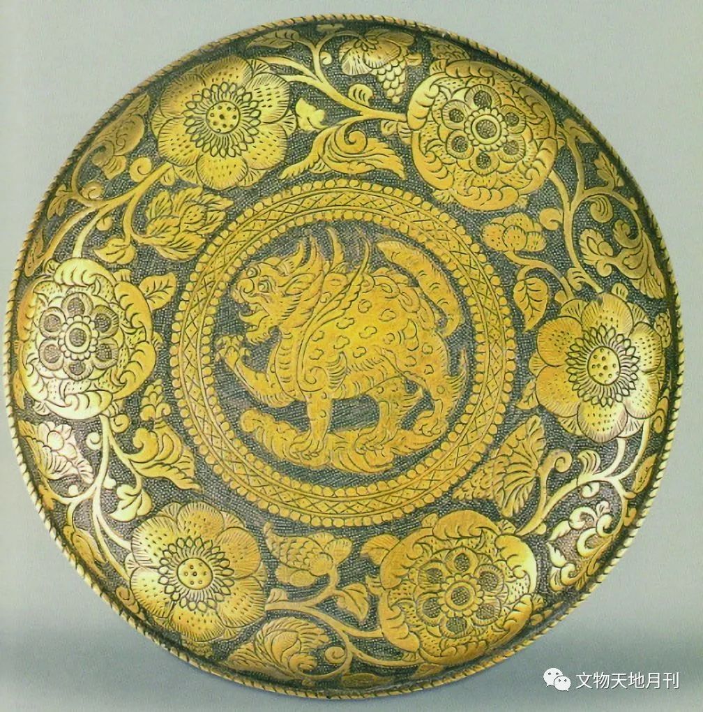 至萨珊王朝(224~651,也称波斯第三帝国)时期,古波斯文化发展至巅峰状态,其文化影响力遍及西欧、非洲、中国及印度。萨珊金银器在造型与装饰上从雄壮豪迈向清丽典雅、细腻纤巧发展,世俗性的宫廷特色代替了宗教性。在公元8世纪中叶以前,萨珊银器上就曾大量出现一种名为“塞穆鲁”的兽身鸟翼的神兽。唐代金银器造型纹饰受萨珊风格影响甚多,然具体到翼狮纹上,又可以说是中国“本土化”后的翼狮形象结合萨珊风格后的再次转变。