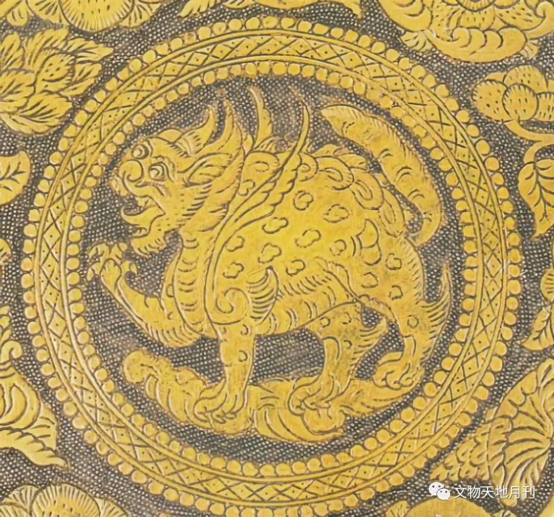 该纹饰圆框内为飞狮纹,飞狮又称“翼狮”,异域风格鲜明。狮子是典型的非洲动物,从两河流域东传,主要分布在伊朗南部、阿富汗和印度河流域,中原地区没有本土狮子。