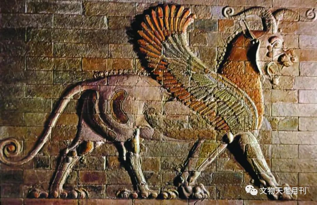 至公元前第二千纪晚期,翼狮形象通过亚述帝国传播至埃兰及后来的波斯,通过贸易路线又传至高加索山脉和里海地带。波斯翼狮中造型细节最完整的代表是波斯第一帝国阿契美尼德王朝(前550~前330)大流士一世时期苏萨王宫墙壁上的浮雕翼狮,为狮头羊角,前足为狮足,后足为鹰爪,双翼生在肩部,可看出其有力双翼的形象更接近两河流域。在波斯日用工艺品上,一些翼狮形象虽不太完整,如翼狮黄金角杯、阿契美尼德黄金手镯等,但总体上仍稳定地呈现出鹰、羊、狮子三种动物的代表性特征,且都还有作为崇拜的具体之神的含义,故可以认为埃兰的波斯人和高加索的那夷立人等的翼狮文化直接吸收自两河流域,并内化成自己的文化信仰。