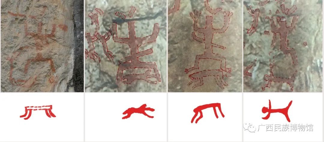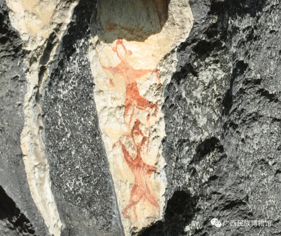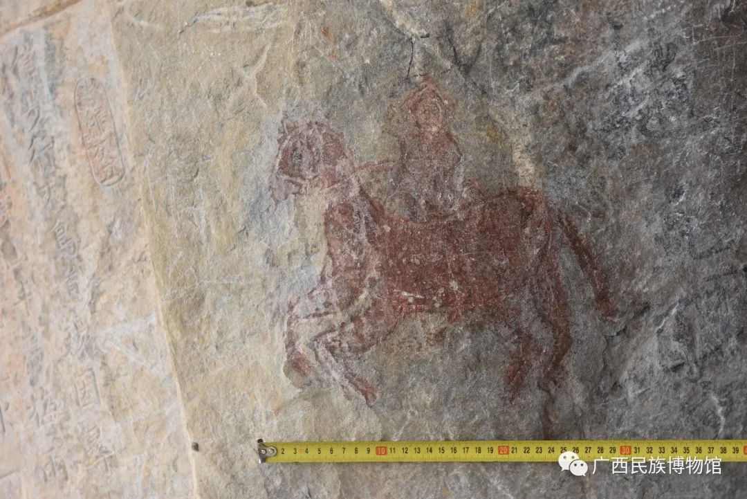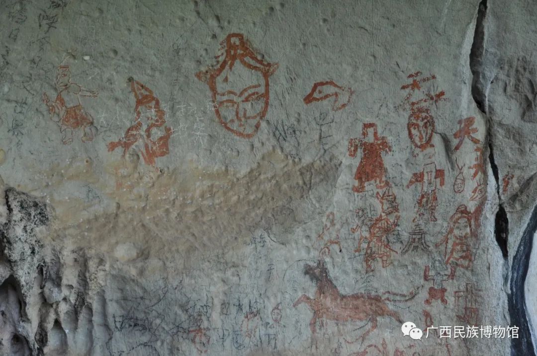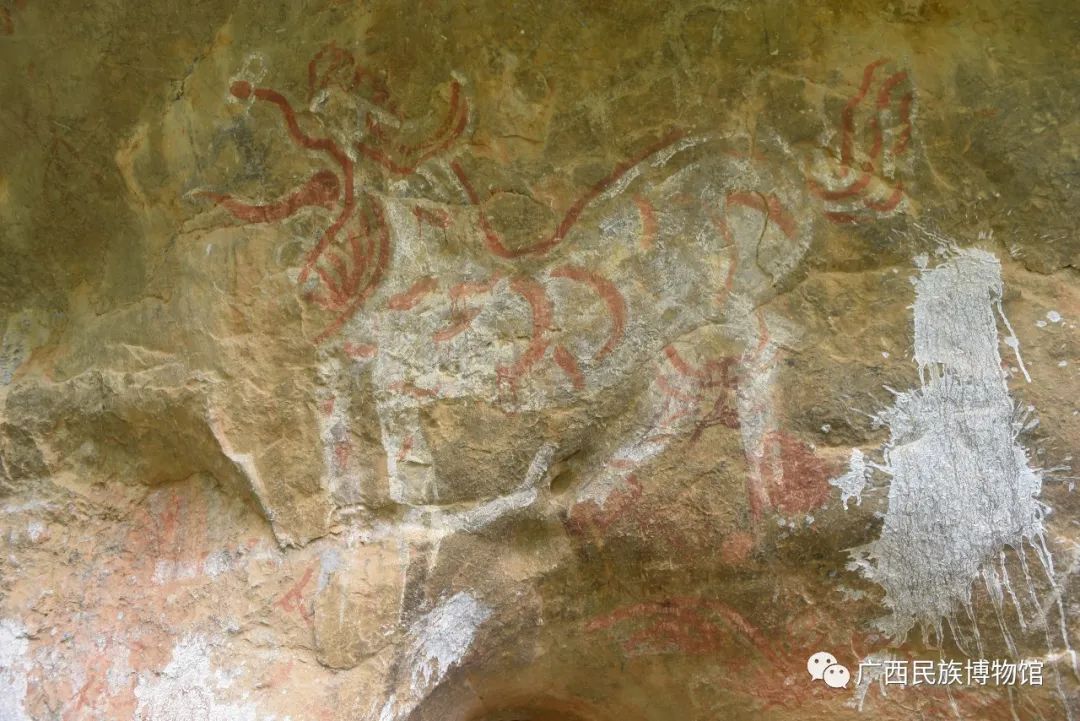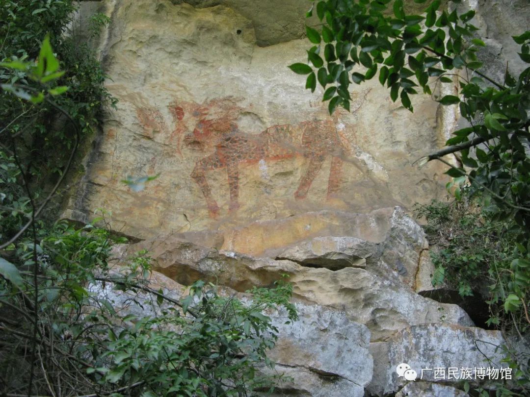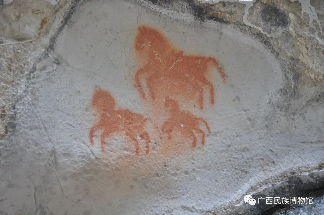 除左江花山岩画外,在崇左市境内,还有一些艺术风格和表现内容不同的涂绘岩画,目前共发现14个岩画点,主要分布在江州、扶绥、天等、大新、凭祥5个县市区。这些岩画以赭红色涂绘为主,兼有白色、黑色。与花山岩画相比,这些岩画点的分布位置相对分散,图像个体尺寸较小,有人物图像、动物图像(猫、马、鹿等)、人骑图、几何图像、抽象符号等,部分岩画上有文字出现,表明绘制年代较晚。