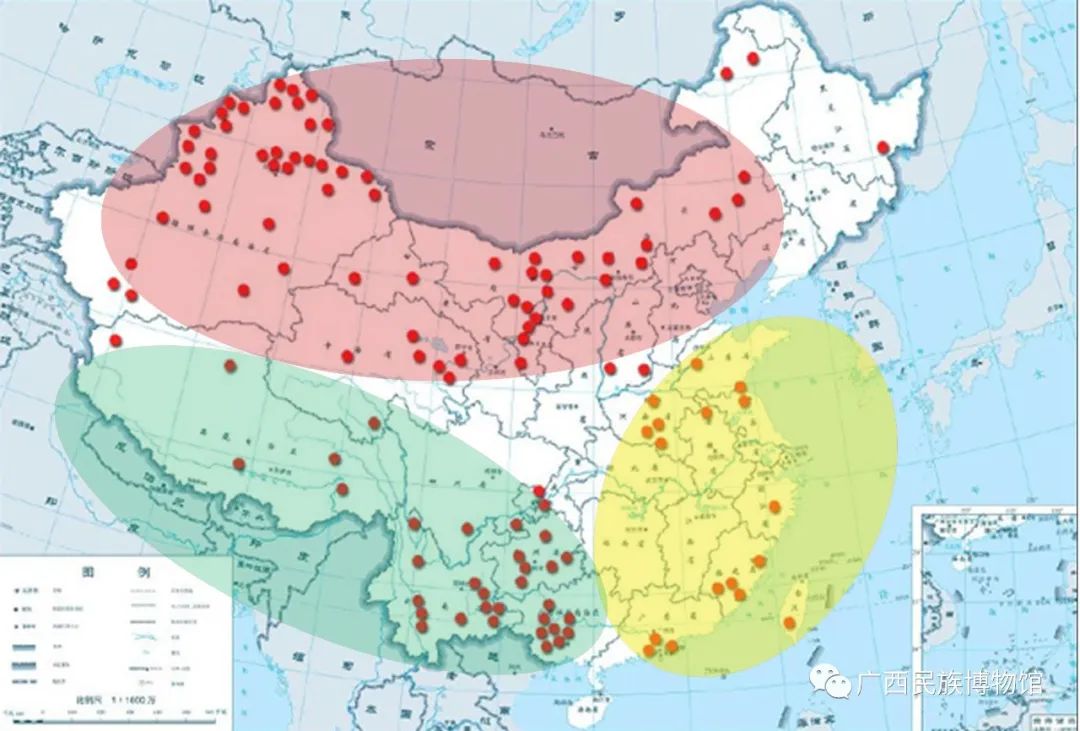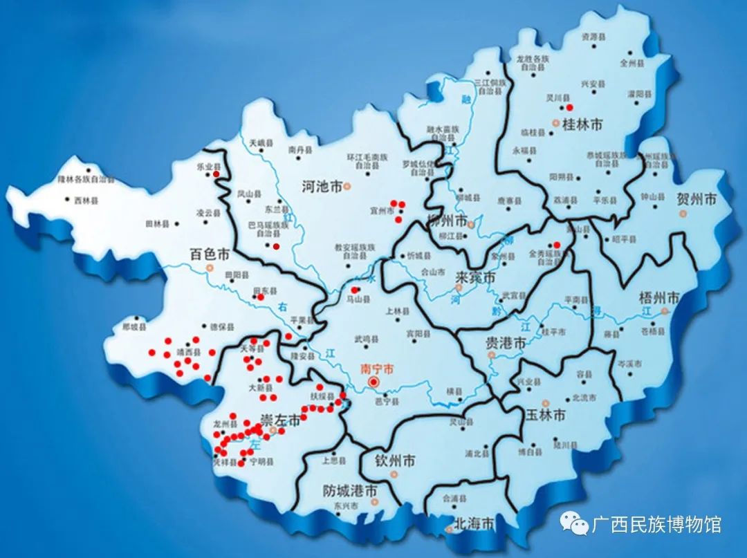 一、广西岩画分布广西地处中国西南,境内岩画资源丰富,主要以红色涂绘岩画为主,有少量凿刻类岩画。以花山岩画为主的左江流域岩画是广西岩画的典型代表。自上世纪五十年代左江花山岩画被发现以来,专家学者们在左江流域开展了大量的基础调查研究工作。目前,在广西共发现岩画点110处,涉及6市15个县(区),主要分布于桂西、桂西南的左右江流域,以花山岩画数量最多,在桂中、桂北、桂西北地区也有少量分布。