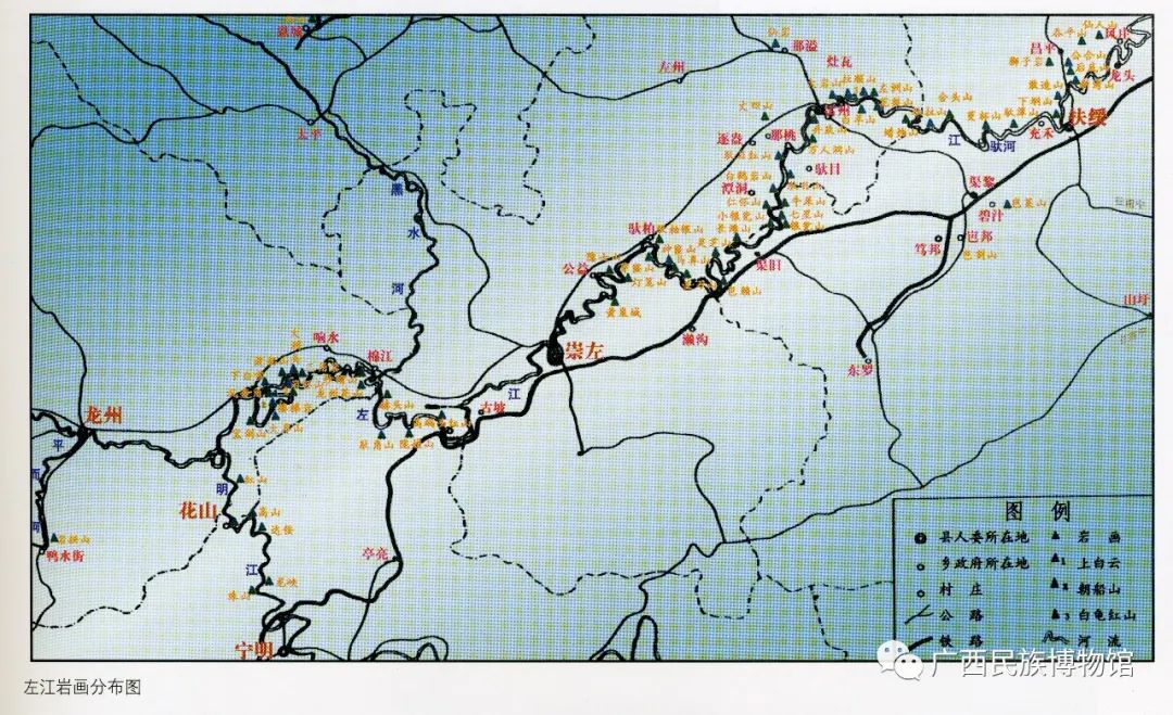 这些岩画点多位于江水转弯处的灰黄色岩壁上,规模大,数量多,尤其以宁明花山岩画最为典型。该处岩画长约172米,高约50米,面积达8000多平方米,可辨认的图像有1951个,是目前发现的单体面积最大、内容最丰富、保存最完好的一处岩画。