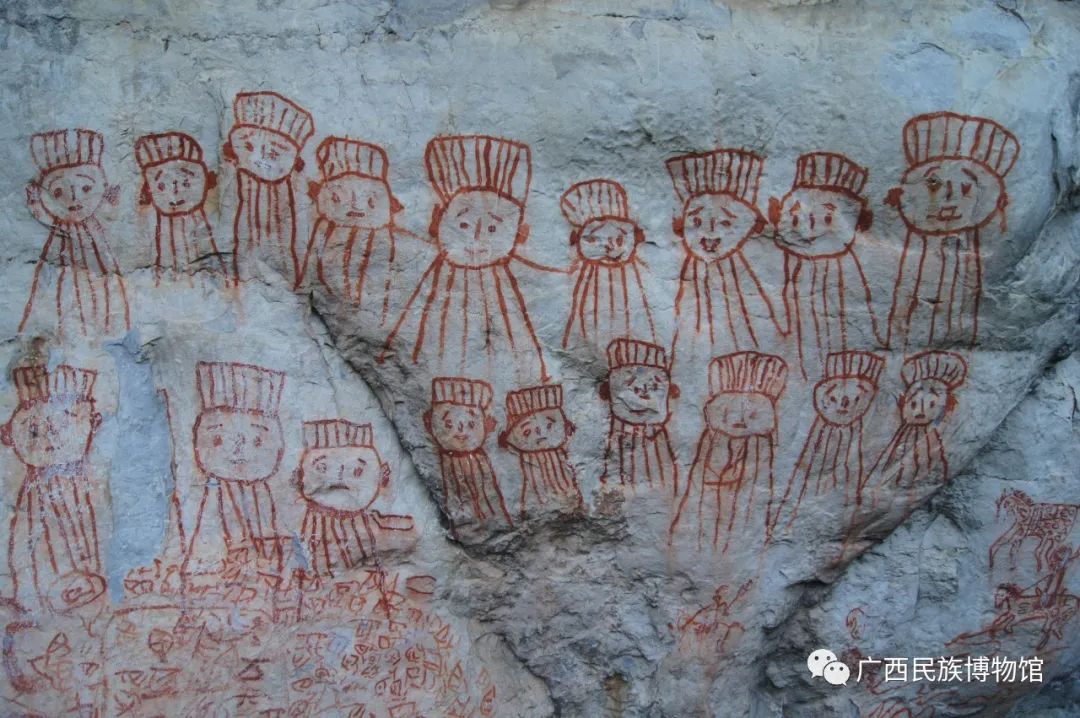 包括金秀、马山等县的岩画。帽合山岩画位于金秀瑶族自治县桐木镇,岩画东西宽约8.7米、高约2.2米,用红色颜料绘成,画面以人像为主,还有马、龙、星、鸟、怪兽、云形、圆圈、似文字符号等图像。根据岩画人像装饰及头顶的盘状包头分析,岩画可能为当地瑶族所绘,岩画内容与宗教祭祀礼仪有关,绘制年代学界倾向于明代。马山岩画仅见一阴刻的手掌印,生动形象。