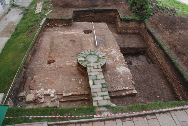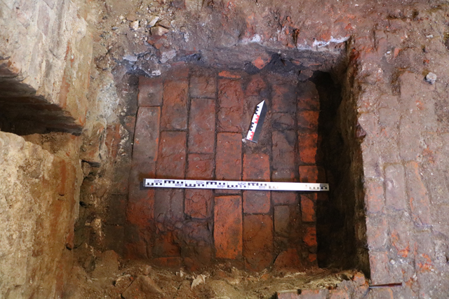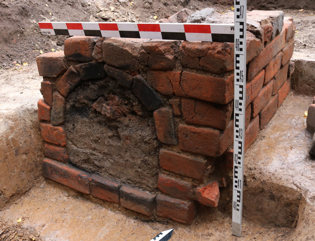 Под полом XVIII–XIX вв. выявлена еще одна выстилка, выполненная из большемерного кирпича, а под ней – один ряд горизонтальной выкладки из некрупных валунов, сложенных насухо. Под этой выкладкой обнаружен верхний обрез фундамента западной стены воротного проема. Возможно, мостовая из валунов появилась на первом этапе строительства, но вскоре, после ликвидации ворот, послужила основанием для пола устроенной в них палатки.