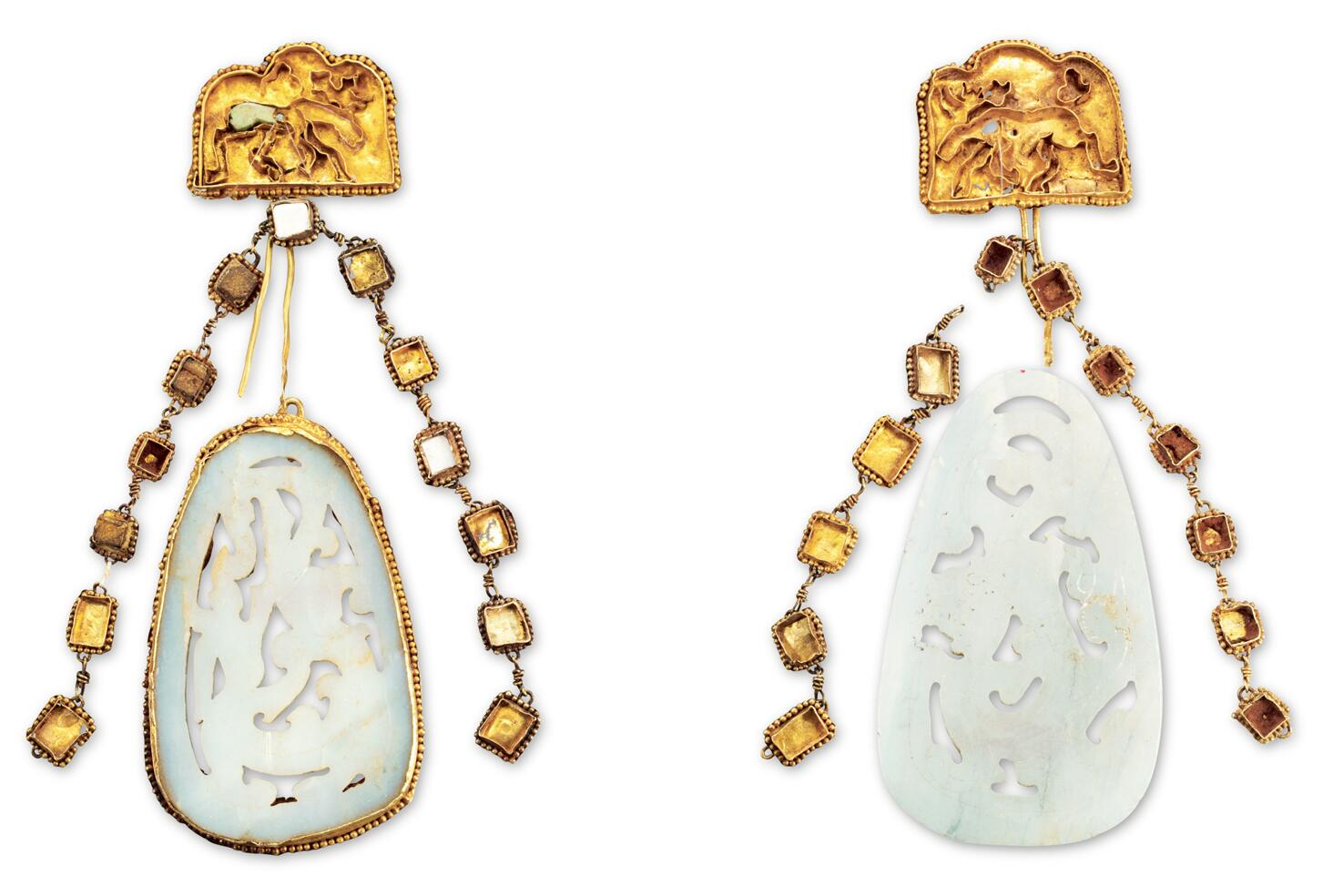 这对耳环出土于一座公元前2世纪的女性墓。墓主人可能是匈奴政治联盟下某一部落或属国的贵族,这一联盟在很大程度上控制着北方草原。这对耳环的质地为黄金,镶嵌有半宝石和透雕的椭圆玉石,展现了匈奴和汉两大文化中多种文化的艺术和审美。匈奴和汉,长期以来是东亚邻国,两者的关系是理解丝绸之路东段早期历史的核心,却经常被简化为一种对立关系。这对耳环讲述了一个更为复杂的故事,与外交、贸易、通婚,以及技术和文化交流有关。它正处于这些文化重新谈判领土和国际关系变化的时期,这一过程导致了长距离欧亚贸易路线,即丝绸之路的扩展。这对耳环还反映了整个丝绸之路地区上,沿着欧亚大陆生态界线分布的内欧亚民族和外欧亚民族相遇的故事,以及他们与其他物质或器物之间的交流。除此,我们也不能忽略这对耳环可能是某个人的珍贵财产。我们不可能通过她的眼睛来看待这对耳环,但作为研究物质文化的历史学者,我们要努力理解她所生活的那个世界,那个塑造了她对周边事物的认知和反应的世界。匈奴和草原