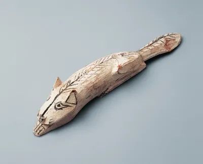 木卧狗由松木雕刻而成。匍匐而卧,前腿前伸,后腿曲卧,头部压在前伸的腿上,小耳微耸,尾巴托于地上。通体施白,墨线描绘耳、嘴、眼、鼻、胡须、前爪及背部、尾部的毛。刀法洗练明快,表现手法巧拙相济,素描式定格出家犬伸展腰部的放松瞬间,极为传神。
