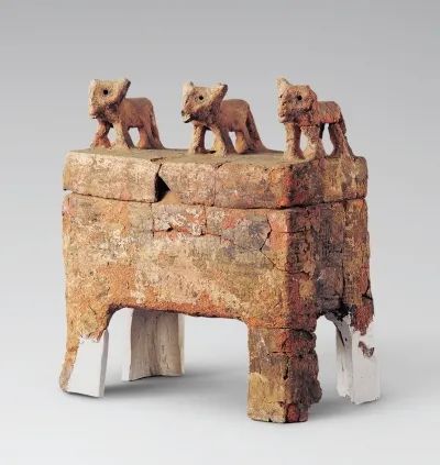 夹砂粗红陶。鼎呈方形,有盖,四足。盖钮为三犬并立的形象,三犬均为小耳直竖,双目圆睁,小口微张,尾巴夹紧下垂,似作警戒状。方鼎上原绘深灰色网带纹,并有凸起感,现已大部分脱落。四坝文化因首次发现于甘肃省山丹县四坝滩遗址而得名,主要分布在甘肃省河西走廊中西部地区,是一支属于青铜时代的考古学文化类型。这件三狗钮盖陶方鼎造型奇特,地方文化特色鲜明,是四坝文化彩陶作品中的代表之作。