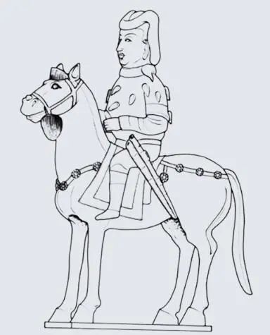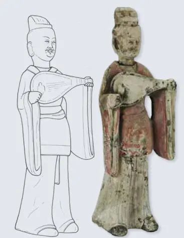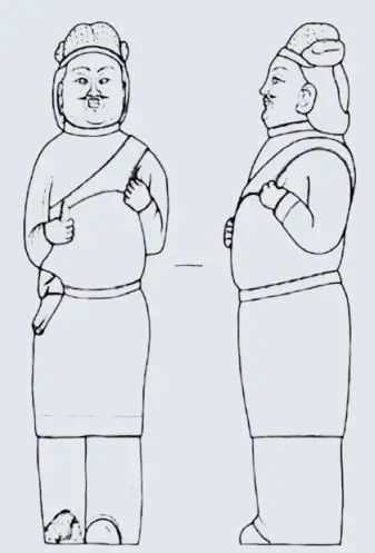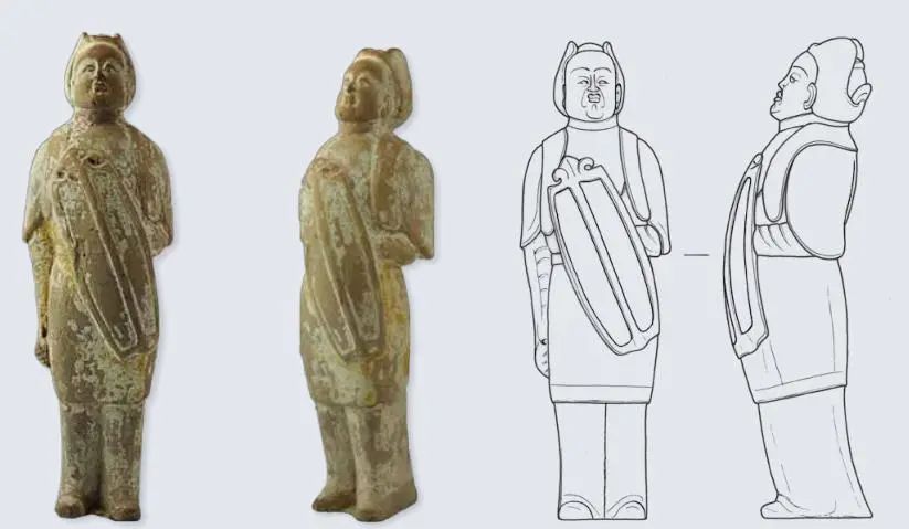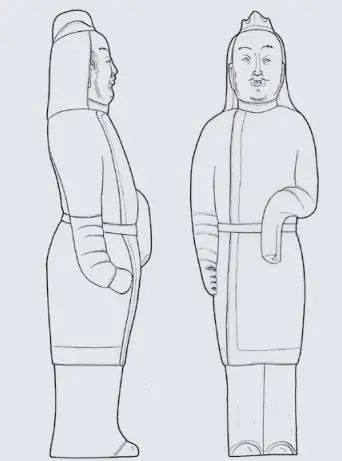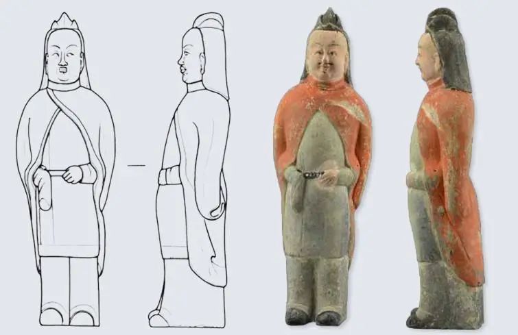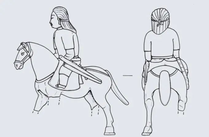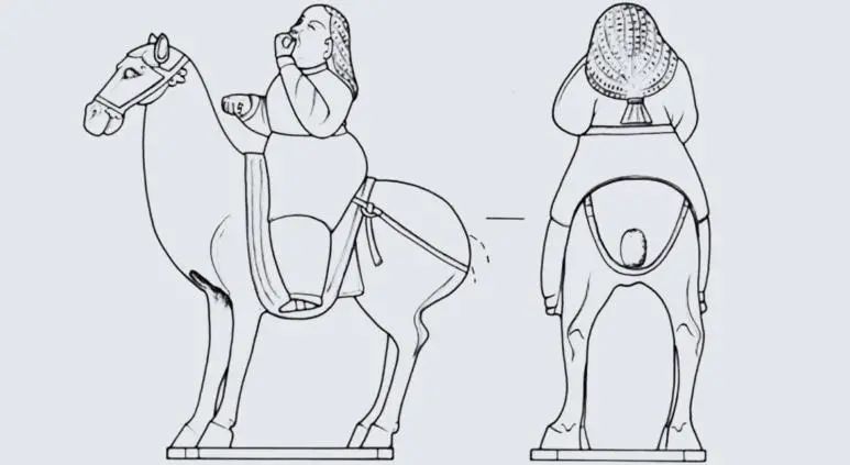 晋阳及周边地区考古发掘所见辫发形象最为典型的是徐显秀墓中出土的辫发俑,此俑面颊丰润,头发分十二辫,左右两侧各一辫系于脑后,余者披于肩背处,身着窄袖圆领袍,佩剑携箭,纵马前行,足见精悍野蛮之风。再如贺拔昌墓所出辫发俑,额前头发似被剃去一部分,余发作扇形拢于背部,长发分为十三辫,中间一辫较细小,其余十二辫皆有月牙形小印,当为表现辫上小结,辫发下端以红绳系结,垂于腰间。由此可见鲜卑人辫发亦有多种不同形式,且非常注重装饰性,打理得井井有条,整洁细致。