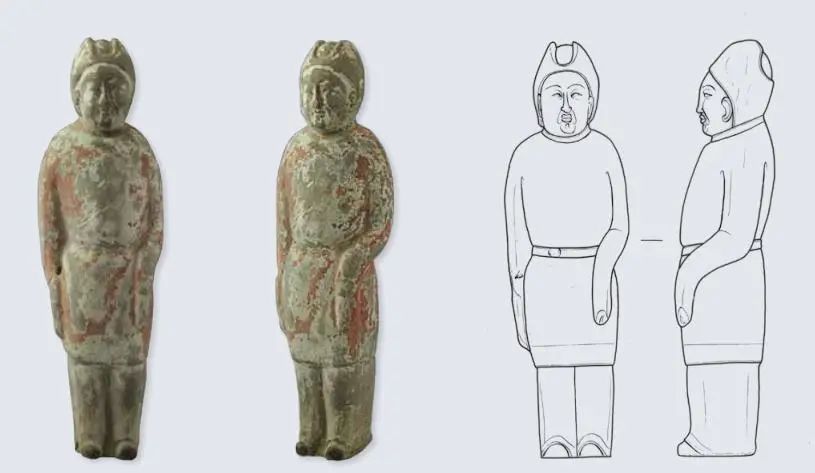 小冠又名平巾帻,为古时平上帻演变而来,头顶前部低平,与其雏形平上帻相比,平巾帻后部明显呈坡面状高耸,但高度、广度皆逊于一般的冠,着戴时不能包裹整个头部,仅能束罩发髻。《晋书·舆服志》云 :“冠惠文者宜短耳,今平上幘也。始时各随所宜,遂因冠为别。介帻服文吏,平上帻服武官也。”《宋书·五行志》云 :“晋末皆冠小冠,而衣裳博大,风流相倣,舆台成俗。”可见两晋南朝将平巾帻作为官服、常服着戴。娄睿墓、徐显秀墓、张海翼墓、厍狄回洛墓等皆出土着小冠武官俑,从服饰组合形式来看,着小冠者皆穿广袖褶衣,大口及地缚袴,是典型的北朝军戎服饰——袴褶服。厍狄回洛墓中亦有见戴小冠、着袴褶的伎乐陶俑。