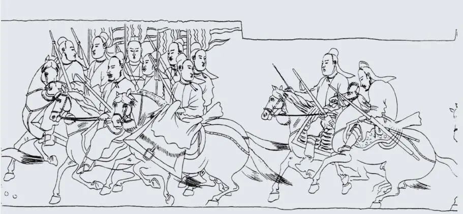 娄睿墓和徐显秀墓壁画中部分人物头顶梳发髻,外包裹幞头,帽裙下垂至肩部,可以很好地避免在骑行时受到风沙雨雪侵袭。《梁书·诸夷传》提到鲜卑族“河南王者,其先出自鲜卑慕容氏……四时恒有冰雪,唯六七月雨雹甚盛 ;若晴则风飘沙砾,常蔽光景”,为抵御这种极端天气,鲜卑族人多“着小袖袍、小口袴、大头长裙帽”,娄睿墓及徐显秀墓中的长裙幞头或许便是文献中记载的长裙帽。至于此类幞头的颜色,文献记载与壁画所见皆相印证,《魏书》称其为“垂裙皂帽”,《梁书·诸夷传》提到北方胡人“着乌皂骑突帽”,《二仪实录》云“古以皂罗三尺裹头,号头巾”,皆与徐显秀墓、娄睿墓壁画中所见人物着戴黑色幞头相互印证。从娄睿墓壁画看,一些马上骑士所戴的黑色幞头的长裙在纵马驰骋之时帽裙随风扬起,显然其材质当为轻薄的丝织物,虽然呈现出潇洒飘逸的视觉效果,但与其他类型风帽相比,巾幞垂裙的实用功能大大降低,装饰性却略有增强。