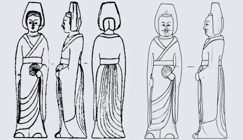 笼冠是北朝时极具特色的首服,虽有汉晋传统汉服的影子,但却被时人归于胡服之列。褚緭曾戏称其为:“帽上著笼冠,裤上著朱衣,不知是今是,不知非昔非。”王国维称其为:“胡服之冠”,其《胡服考》云 :“其制,冠则惠文……胡服之冠,汉世谓之武弁,又谓之繁冠……晋宋以后又谓之建冠,又谓之笼冠,盖比余冠为高大矣。”从形制上来看,笼冠内着平巾帻,外罩笼状物,冠身较高,上部为圆顶,顶面呈长椭圆形,左右两侧向下微外弧,遮住双耳。其内衬的平巾帻大部分被笼冠罩盖,仅于额上露出颜题,脑后露出帻耳下部。从《胡服考》中所提到的武冠、武弁等名称看,笼冠最初时或为军戎服饰,但从考古发现的北魏、北齐陶俑来看,戴笼冠者多穿传统的汉式广袖长衣,丰颐阔面,神情肃穆,仪态端庄,全无武者骁勇之态。娄睿墓、厍狄回洛墓等多座墓葬中皆有发现女子戴笼冠者,河北磁县湾漳大墓还有伎乐人员头戴笼冠,可知北齐时笼冠适用范围较广,已不仅仅限于官服体系之中。