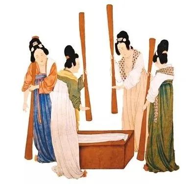 在唐代开放思维的影响下,妇女成为了那个时代最亮丽的一道风景,在千古流传的画作中,就有一幅清晰地记录了唐代妇女协同劳动时的风采。这幅由唐代画家张萱创作的《捣练图》是一幅工笔重设色画,纵37厘米,横145.3厘米。“练”是一种丝织品,刚刚织成时质地坚硬,必须经过沸煮、漂白,再用杵捣,才能变得柔软洁白。《捣练图》长卷共刻画了十二个人物形象,按劳动工序分成捣练、织线、熨烫三组场面。第一组描绘四个人以木杵捣练的情景;第二组画两人,一人坐在地毡上理线,一人坐于凳上缝纫,组成了织线的情景;第三组是几人熨烫的场景,还有一个女孩淘气地从布底下窜来窜去。画中人物动作自然,细节刻画生动,妇女扯绢时用力地微微后退后仰,表现出作者观察得细致入微。此画作线条工细遒劲,设色富丽,“丰肥体”的人物造型,表现出唐代仕女画的典型风格。