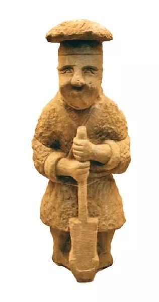 我国多地曾出土过一种汉执锸箕俑,它的形象就来源于汉代农夫,其中最著名的一件藏于中国农业博物馆。该俑高74厘米,头戴笠帽,一手持锸,一手持箕,腰插长刀,脚踏草鞋,面部表情生动,嘴角流露出会心的微笑,高卷的裤腿,有力的双脚,展现出乐观勤劳、善良可亲的劳动者形象。