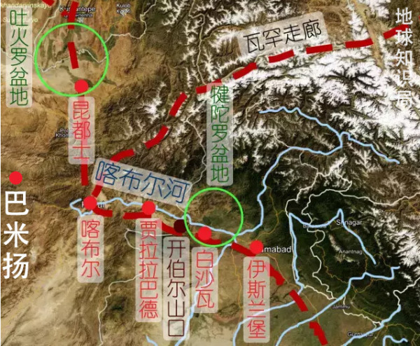 瓦罕走廊路线:犍陀罗盆地——喀布尔——瓦罕走廊——塔什库尔干——和田绿洲(于阗)