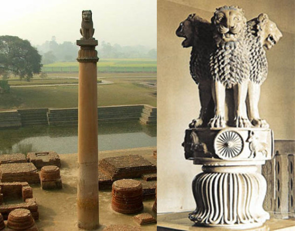 左为瓦拉纳西的阿育王石柱,右为鹿野苑阿育王石柱柱头——印度国徽图案就来源于此