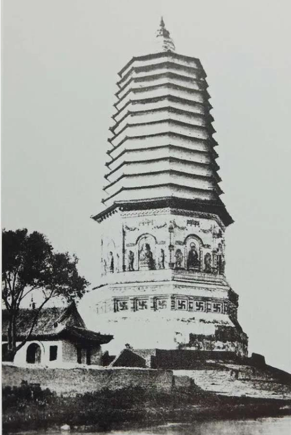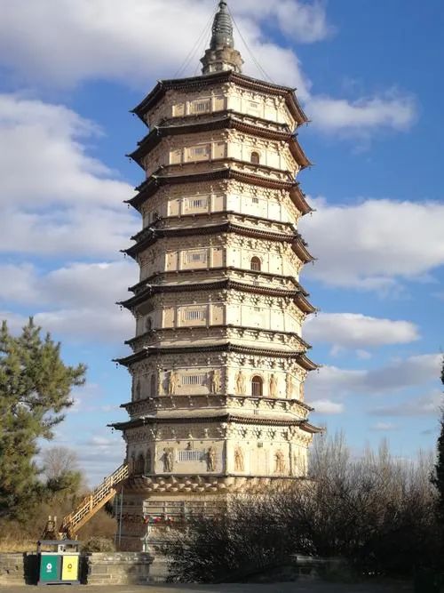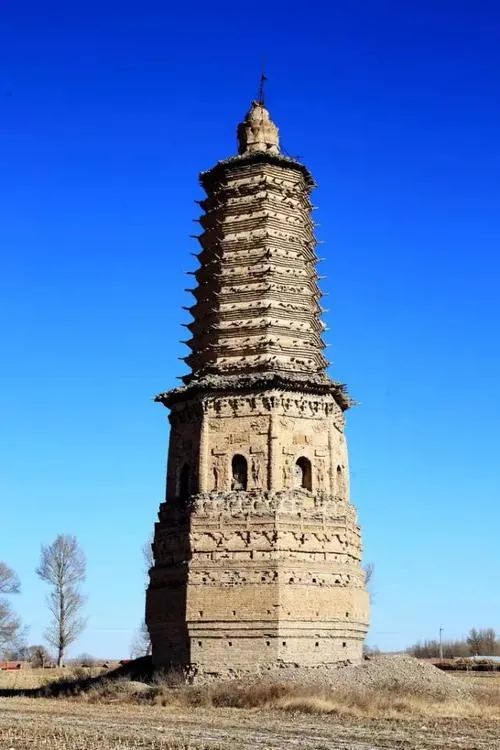 建于辽代早期。八角密檐式佛塔,塔檐残存十一级,残高三十六米,塔座每边长六点二米,塔身南、北、东、西面为佛龛,其余四面为砖雕紧棂窗。
