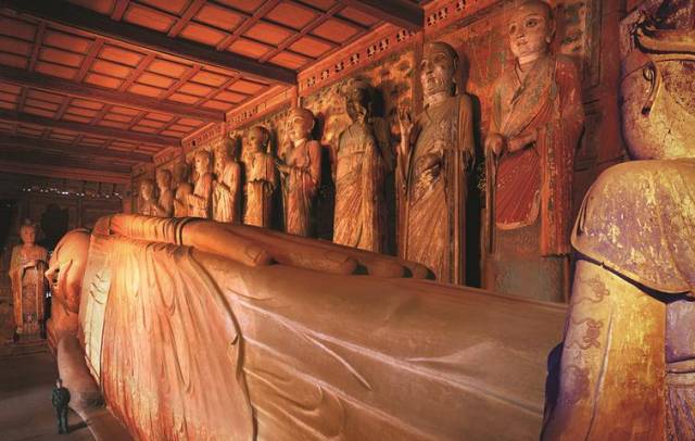 大佛寺始建于西夏永安元年(1098年),寺内安放有国内最大的室内卧佛,也就是佛祖释迦牟尼的涅磐像。他安睡在大殿正中高1.2米的佛坛之上,佛身长34.5米,肩宽7.5米,耳朵约4米,脚长5.2米。大佛的一根中指就能平躺一个人,耳朵上能容八个人并排而坐,可见塑像何等的庞大了。