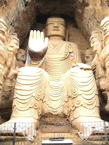 炳灵寺位于甘肃省临夏永靖县城西南35公里处的小积石山中黄河三峡炳灵寺石窟17号龛高27米的唐代摩崖大佛建于德宗贞元十九年(公元803年)其上半身用石雕成,下半身用泥塑,部分虽己毁坏,但仍保存着唐代造像面型丰满、比例匀称的特点。全国重点文化保护单位。
