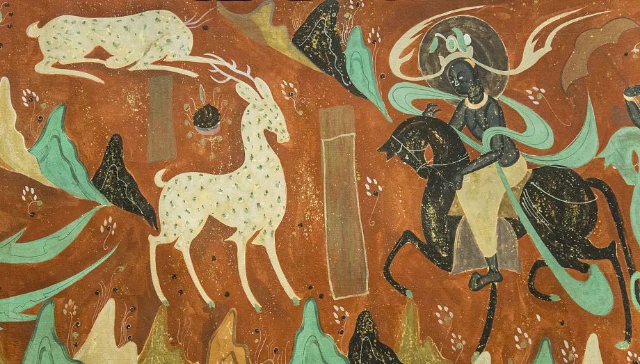 在敦煌壁画中还找到了宣扬善恶因果报应的“九色鹿”的故事的原型。敦煌壁画打开了丝绸之路上生活的历史长卷。商旅出发前的祈祷,由骆驼、马、驴、骡子组成的商队,寻找水源的重要,求医、治病、捕鱼,都通过一个一个具体的画面表现出来。