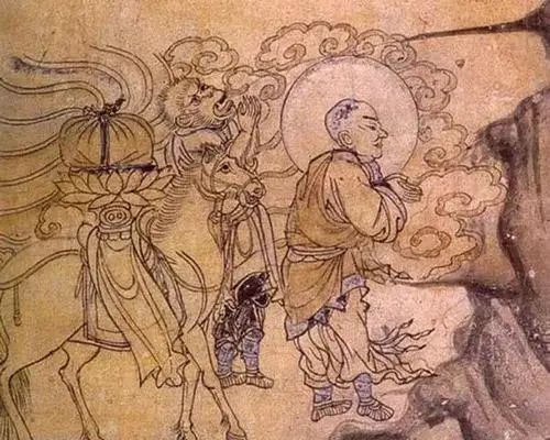 《唐僧取经图》描绘了唐僧取经的故事,猴行者陪伴玄奘在虚白光中认敬菩萨影像,把经变的严肃性和传说的趣味性巧妙结合,形成佛教中壁画形式的创新。