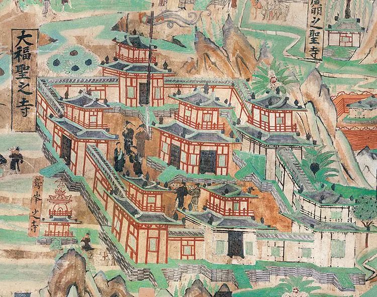 敦煌壁画中的《五台山图》要比《清明上河图》出现得更早,它规模宏大,是世界上罕见的全景式形象地图,画中详细描绘了东起河北正定,西至山西太原,方圆500里的山川地形和社会风情。图中的地理状况与现实基本一致,沿着画面上的线路,人们可以准确地到达五台山。20世纪30年代初,著名建筑学家梁思成教授认为,这幅地图的准确性令人不可思议。