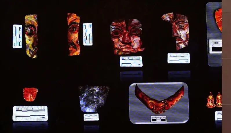 29号墓,有两件尺寸大小不一的金银面饰,金面饰有内扣设计,处于墓主的左臂之上。银质梯形面具,尺寸超过10厘米,出土时正好敷在墓主人的脸部。