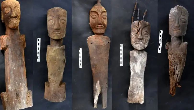 西藏自治区文物保护研究所副研究员、桑达隆果墓地考古发掘领队 何伟:它们出土位置是临近的,有彩绘的金银面饰,它是敷于这个木俑的脸部的。