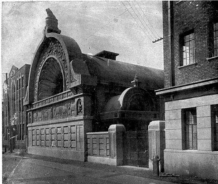 上海别院修建完工后,建筑面积四百零七平方米,整体建筑布局坐西向东,尤其是沿街礼堂的巨大拱形莲花瓣券面如火焰,建筑平面极具张力。寺院落成典礼也充满仪式感,在日本驻华大使重光葵和众多中日政教要人见证下完成,尤其是中国这一侧原同盟会元老王一亭的参与也特别引人注目。王一亭、大谷光瑞曾作为孙中山幕僚,积极参与民国初年政治活动,在上海拥有一批早期同盟会旧友政治势力。王一亭早年追随孙中山、黄兴,负责同盟会上海分会的财务收支,为革命军筹措军费,颇有权柄。此外王一亭与日商汽船运输公司合作经营,在与日人合作中获利颇丰。后因讨袁革命失败,弃政从商,热衷于宗教慈善和文化艺术事业。一九二三年对于东京大地震的组织救援得力,还被邀请到日本东京与天皇一同进餐,当时在上海中日政界内拥有很高威望。晚年王一亭笃信佛教,也被选为中国佛教协会领袖,他筹款协助支持西本愿寺宗教事业也在情理当中。