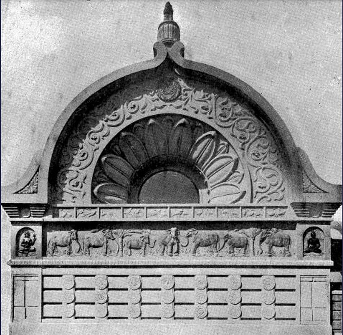 艺术总是先于时代变化而变化。大谷光瑞在上海这个“世界之都”内建立印度样式的寺院,这既与之前流行的移植欧美建筑风格完全不同,也与日本建筑师在伪满洲国推行的“帝冠式”大屋顶建筑不同,在建筑史上无疑是特殊的。上海别院外壁装饰中仿造阿旃陀石窟建筑、佛教造像和纹样,的确与佛教《阿弥陀经》思想有一定关联,这些结合佛经思想和印度式佛教建筑在过去未曾出现,印度风格建筑一定程度上显示了大谷光瑞不同的文化取向和“借古喻今”的思考方式。但作为文化精英的大谷光瑞在主持设计这栋建筑时,其思想已发生变化,上海作为日本向世界展示其文化包容性和多元化的场所,既需要配合日本军政界提出的“大东亚共荣圈”的方针,又要在宗教文化中找到其合法性,曾经探险过的印度文化元素成为笼络政教两界的抓手。