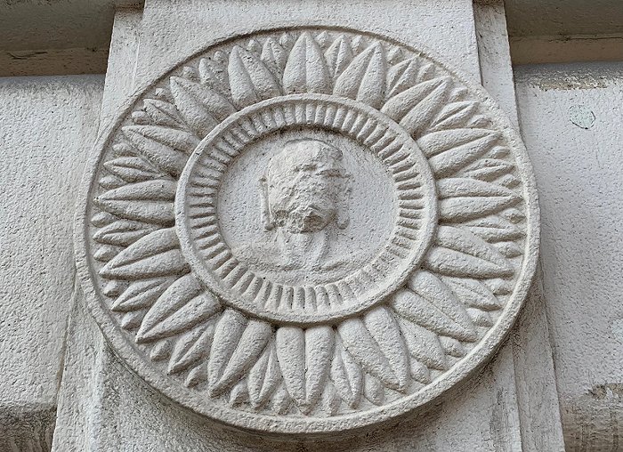 为上海别院供应建筑材料的是淡海洋行,其创始人太田常治出身草根,一九〇五年来华独立创业。太田依靠其商业头脑和热情服务,到一九三五年已经拥有一百五十位雇佣工人的公司,并且也成为上海唯一的日系石材加工厂,代理很多日本大型会社的驻中国大理石贸易,成为上海建筑市场中举足轻重的供应商。上海西本愿寺所选取石料来自福州产花岗岩,雕刻师为日籍工艺师渡边素川,上海别院整体的大理石装饰整洁素雅的色调也是当时流行的新装饰主义思想。现存墙面上装饰有十块禽鸟浮雕和二十一朵莲花浮雕,形态各异,保存清晰完好。在券面顶处有一座蹲狮雕刻,是根据印度阿育王石柱雕刻的;再往下的白色墙面中央原有五只白象,两两而对,左右最两侧橢圆状龛内原镶嵌有佛陀浮雕,分别为结跏趺坐思维和说法姿态,但后期这些浮雕被拆除,现已不存。北面的小型拱券门为入口,其门劵浮雕也做成佛龛样式,礼堂的内部柱列装饰也是采用的阿旃陀石窟柱式,这些雕刻都是手工雕刻完成的。