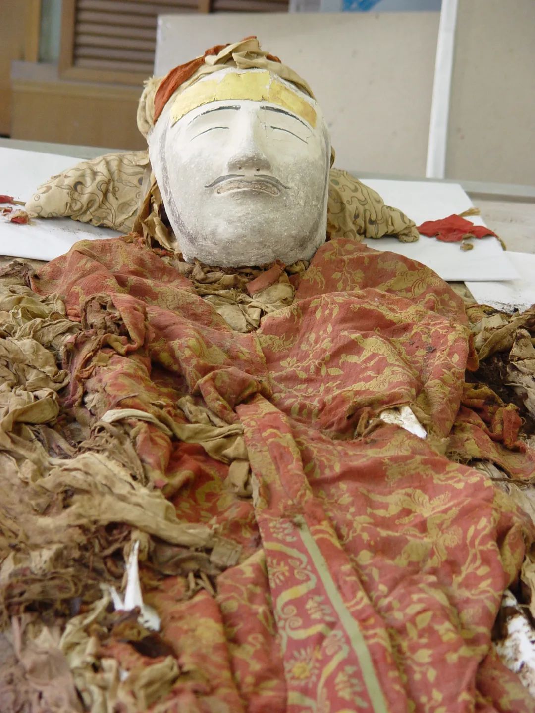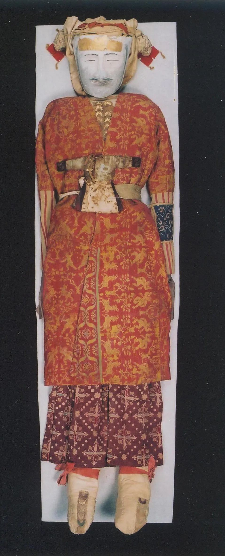 从陈展的效果考虑,男尸服饰以立体形式展出最佳,但若是将所有服饰里外全部原封套在一起,既不可能也不利于保护,所以残破的内袍在揭取后也平整藏贮,只将内袍的领、前胸正中部分的锦绦、贴金印花部分拆下来,缝在以现代绢料制作的袍子上。最后,按男尸原来的穿戴形式,将面具、内外袍、裤、贴金绢袜等用填充物撑起来,仿佛真人一样。为避免穿衣和将来的脱取对服饰产生机械性的损坏,所用的填充物不是一具完整的模特,而是由几部分组合而成。填充物材料选用消毒过的细棉布和脱脂棉,对服饰不会产生污染,也不会有压力(图8)。