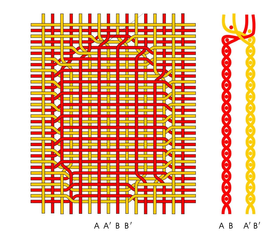 红地对人兽树纹罽是男尸外袍的主面料。为双层组织,由红、黄两色经纬按排列比1:1平纹交织,形成重叠的上下两层,两层组织在花纹的边缘处接结换层,形成两面花纹相同但花色互异的效果——表面为红地显黄色花纹,里为黄地显红色花纹(图2)。经线S向紧捻,合股,密度14×2(双面)根/cm;纬线,Z向弱捻,两根相并,密度44×2(双面)根/cm。
