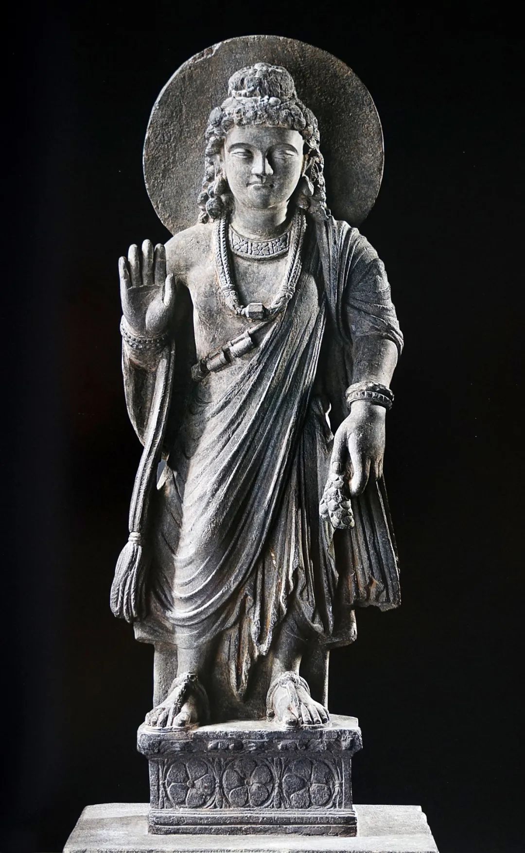 中台山博物馆馆藏犍陀罗一至三世纪“石造菩萨立像”,片岩材质,菩萨神态沉静,具西方面貌特征,深目高鼻薄唇,波浪卷发披肩。菩萨装身饰物华美,手上腕钏,花形臂钏,胸前佩戴三重饰线。第一重是花形宽带颈饰。第二重是由数股线状串成之华丽饰线,两端系住一对瑞兽头,口衔方形圣物盒。动物头饰配件,正是古代草原游牧民族的饰物特征,此条悬挂圣物盒之U形厚重饰线,又称为“圣线”。第三重斜至右胁之饰线,垂挂三个圆柱状小盒,称作“婆罗门饰线”,是古代识别印度婆罗门的标记(婆罗门,当时即指修行人)。