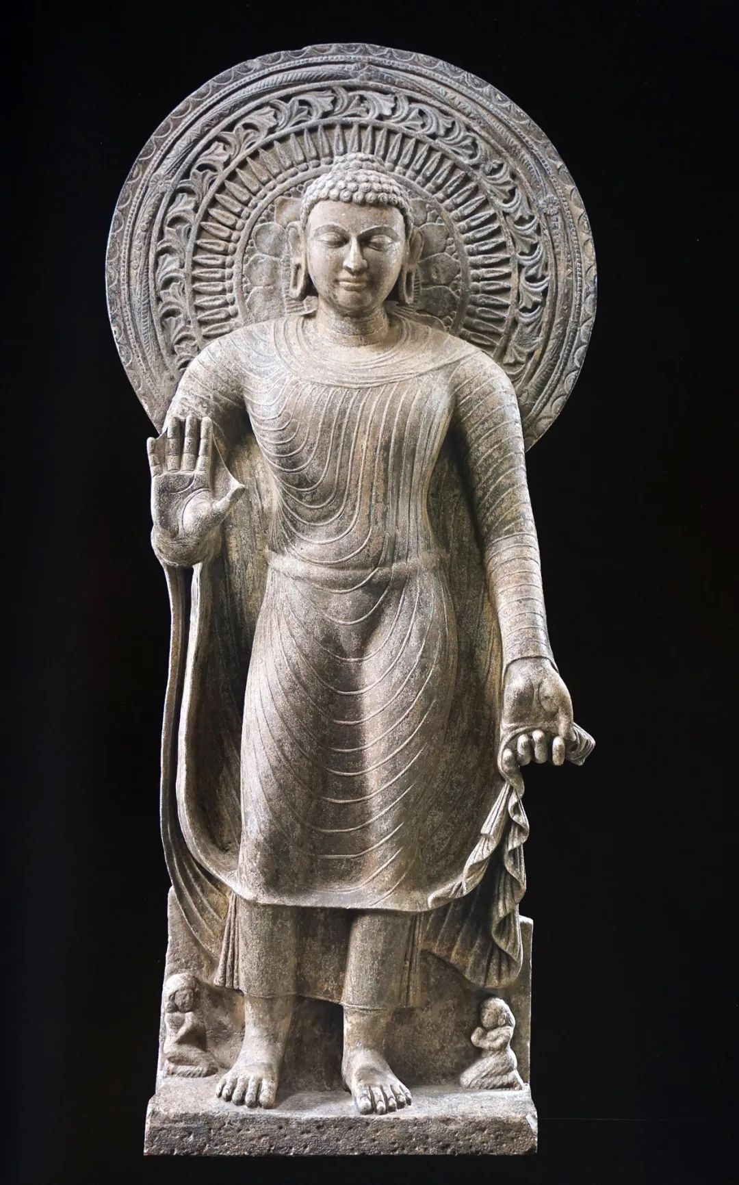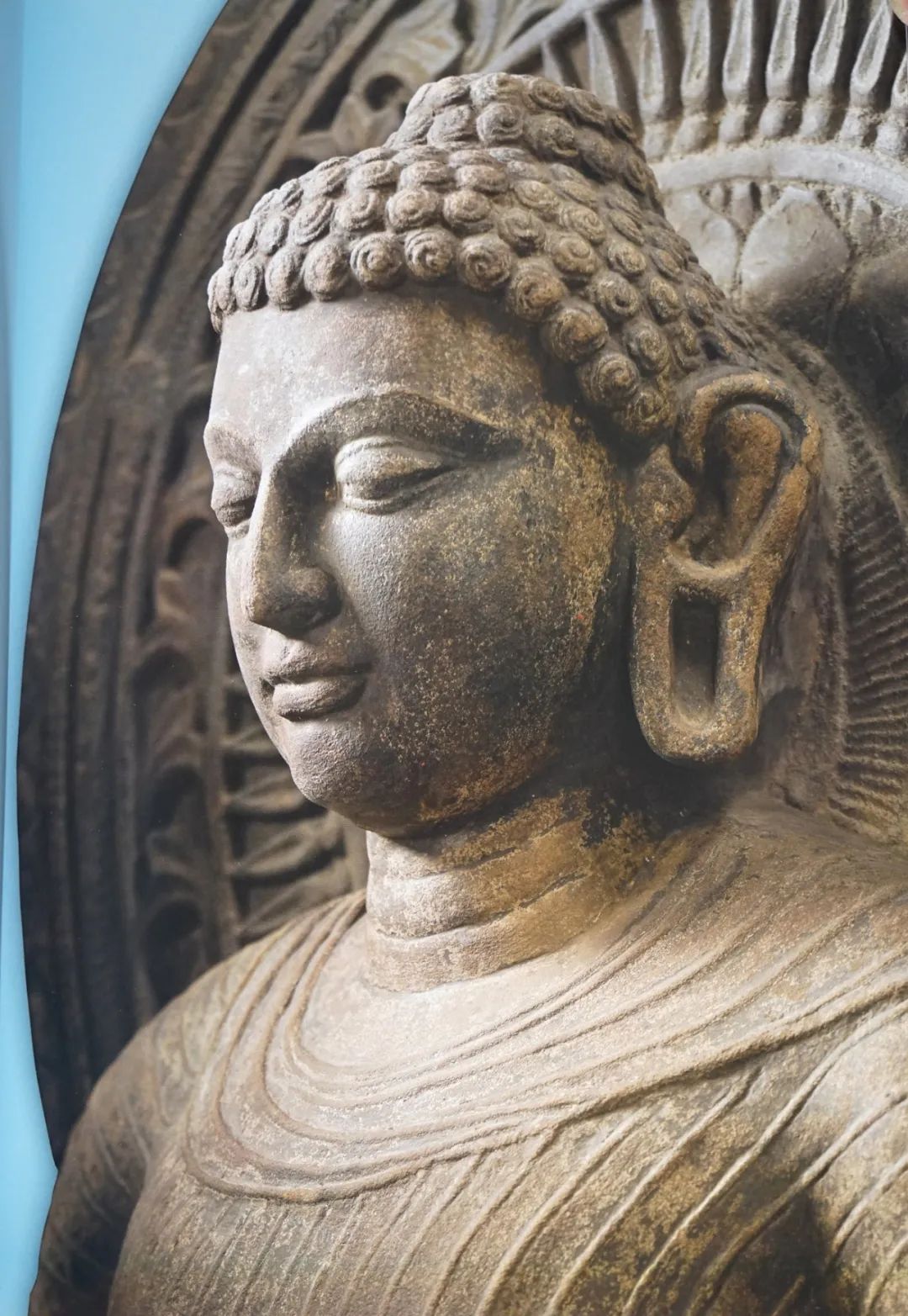 佛头光图案富丽,纹饰精美,由内向外刻有多重同心圆,由中心依序饰莲瓣形图案、放射状纹饰、卷草纹、扭转花环、联珠纹和连弧纹等纹样,华美繁复。整体造像呈现一种气度雍容、沉稳典雅、和谐平衡的古典美感。