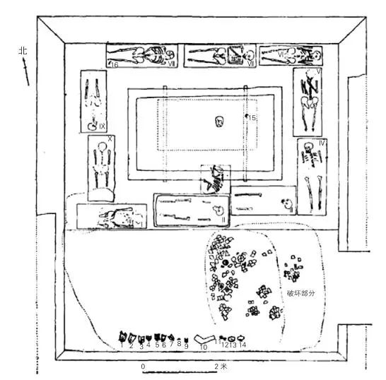 I-X 殉人 1-9. 铜钟 10. 石磐 11、12. 铜卣 13、14. 铜舟 15. 残铜环 16. 铜削